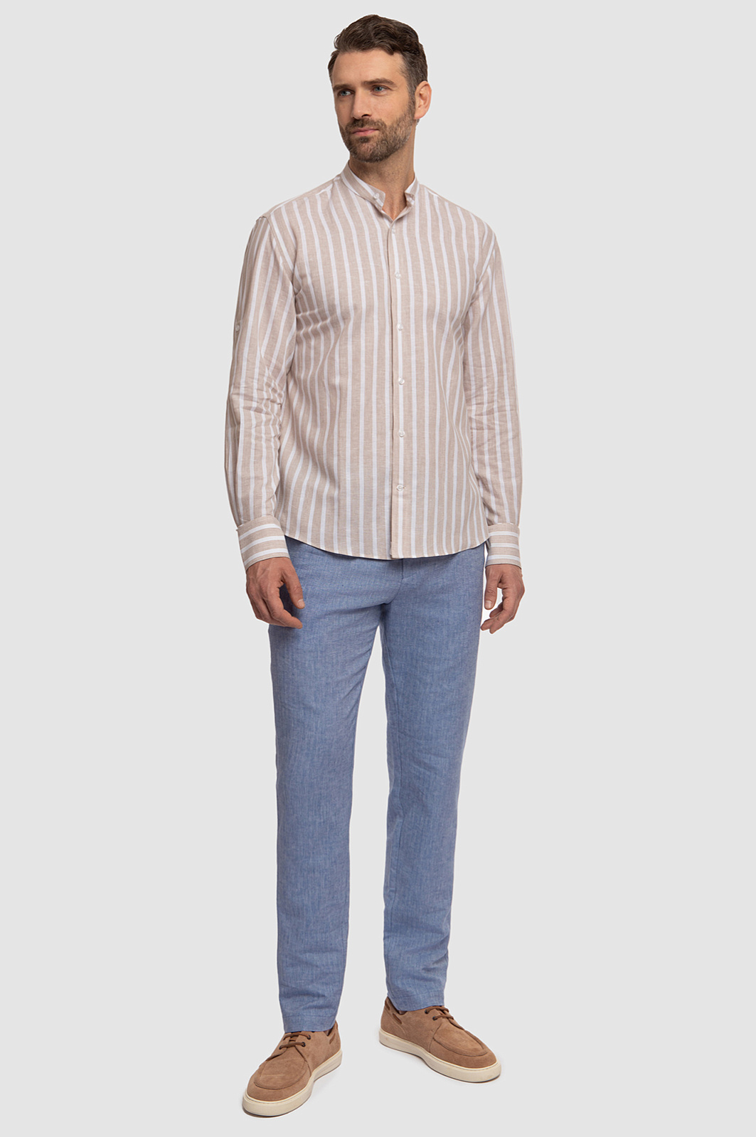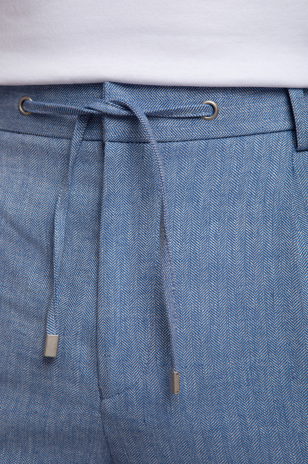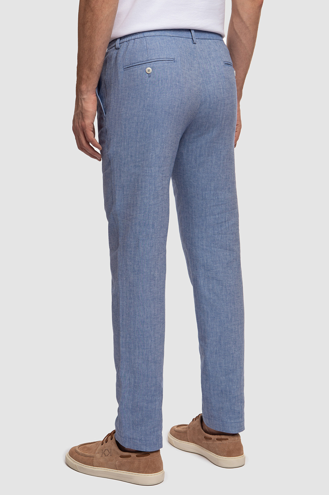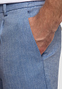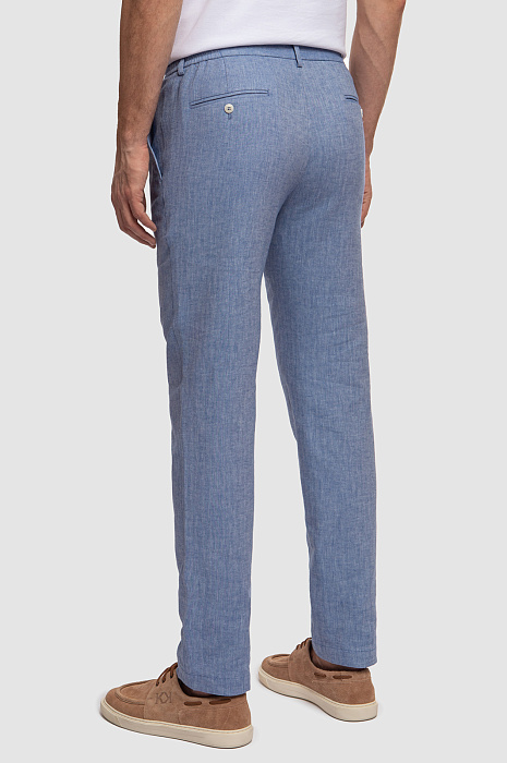 Голубые брюки из нежного смесового материала - идеальный спутник для прогулок в теплую погоду. Комфортную модель сшили из тонкого, легкого охлаждающего льна и прочного дышащего хлопка, который поддерживает оптимальную температуру тела, не перегревая его. Еще более комфортным изделие становится благодаря широкому эластичному поясу с регулируемой кулиской. Переплетение голубых и белых нитей создает уникальный рисунок елочкой. Предлагаем носить брюки KANZLER с четырьмя карманами в качестве основы образа в стиле smart casual: с пиджаком в тон и белым поло.