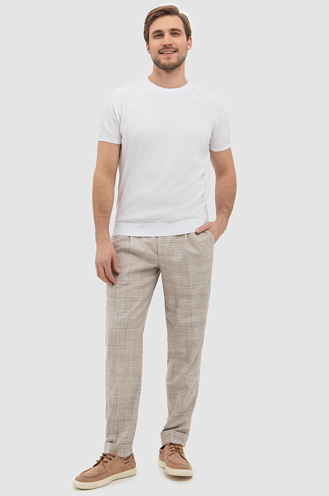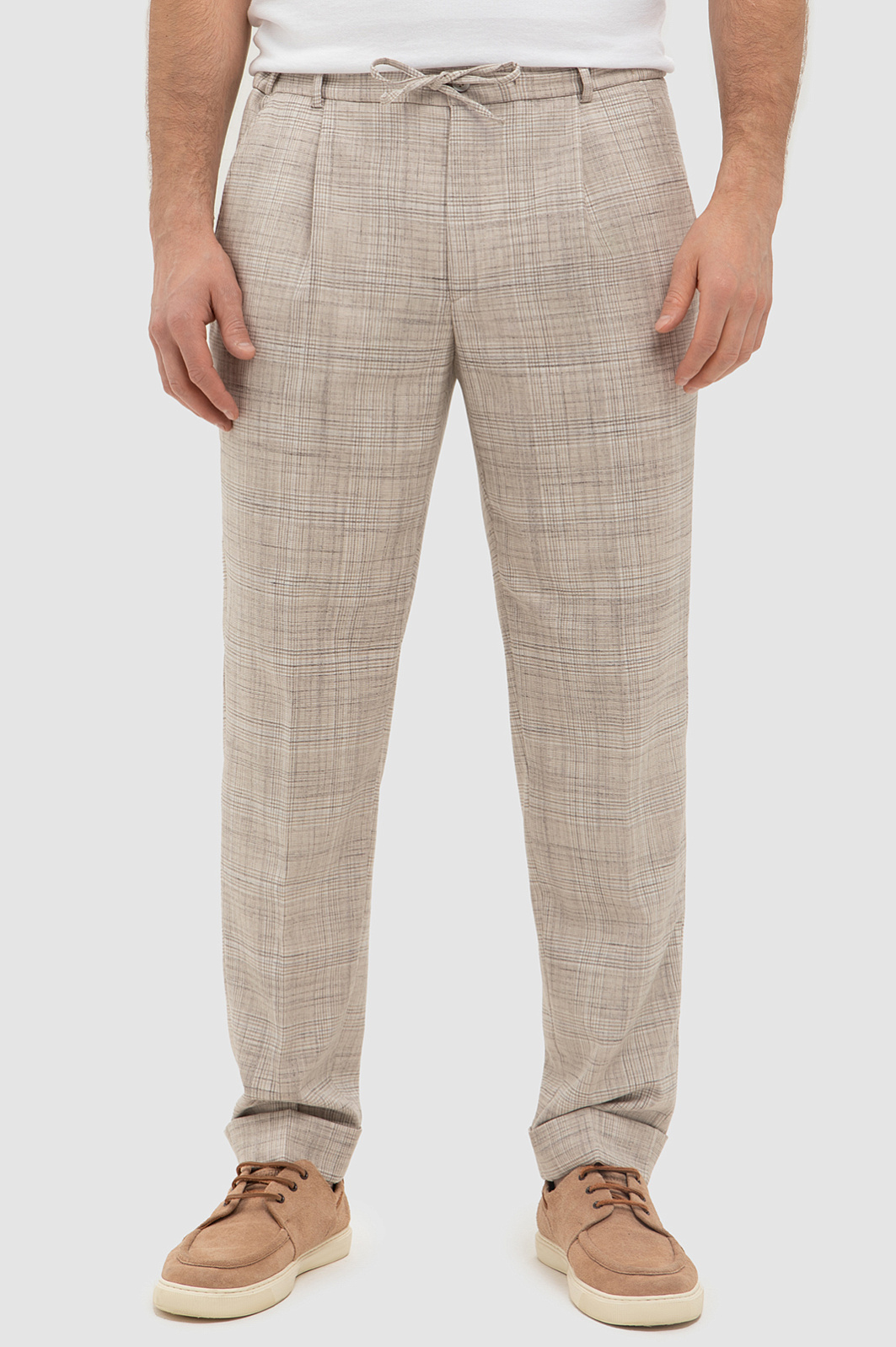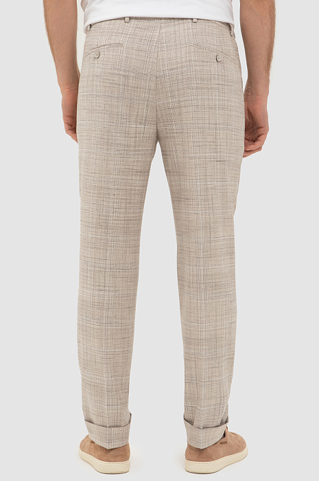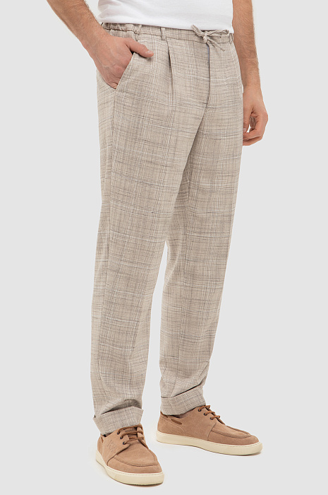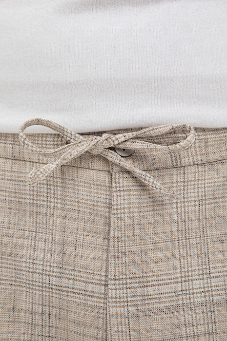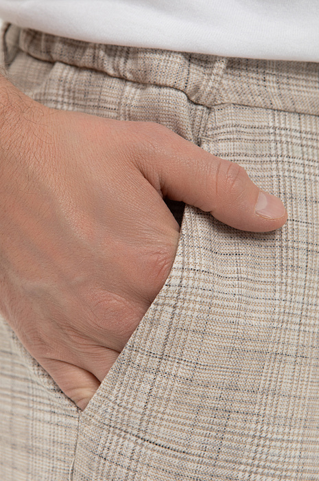 Бежевые брюки на кулиске KANZLER в тонкую клетку — ода средиземноморскому стилю и небрежному расслабленному шику. В одинаковой мере стильная и комфортная вещь вдохновляет проживать каждое мгновение с удовольствием — так, как хочется именно Вам. Отвороты внизу и шнурок на поясе — отсылки к современному городскому стилю. Продуманный состав ткани — союз роскоши, современных технологий и практичности. Волокна льна создают ощущение прохлады даже в жаркий день. Хлопок обеспечивает воздухообмен. Полиэстер и вискоза придают прочность. А эластан (2%) помогает материалу сохранять безупречный вид и форму.
