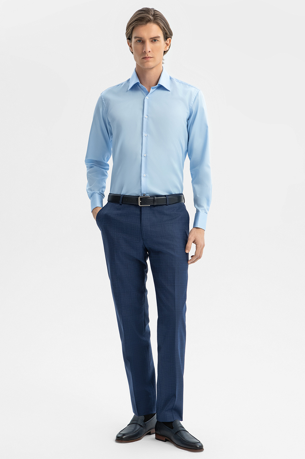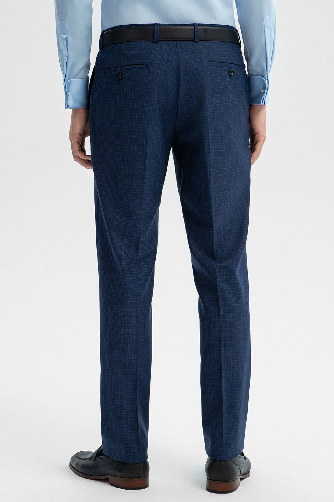 Синие классические брюки KANZLER из шерсти, хлопка и льна с водоотталкивающей обработкой — сочетание элегантности и практичности. Приталенный силуэт стройнит фигуру, традиционные стрелки придают образу выразительность и строгость. Дорогая натуральная ткань с полотняным переплетением сделана из тонкой сертифицированной овечьей шерсти Супер 120S (90%), которая практически не мнется и способна восстанавливать форму. Добавление гипоаллергенных волокон хлопка и льна улучшает воздухопроницаемость и делает ткань легче. Водоотталкивающая обработка защищает материал от намокания и сохраняет аккуратный вид в любых погодных условиях. Параметры модели: рост 191, 97-77-99 Размер на модели: 50