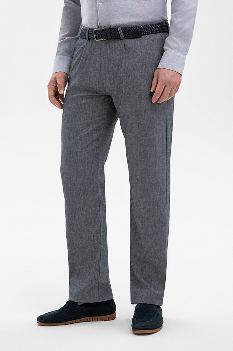 Комфортные брюки KANZLER из смесовой ткани спокойного синего оттенка с лёгким меланжевым эффектом — удачный повседневный вариант для офиса, путешествий и городских выходов. Прямой крой и мягкие защипы спереди обеспечивают аккуратный внешний вид и свободу движений. Плотная ткань создана на основе гипоаллергенного хлопка с добавлением льна, который придаёт материалу благородный, изысканный характер и приятную текстуру. Натуральные волокна усилены нитями полиэстера и вискозы, которые повышают износостойкость ткани. Добавка лайкры (2%) помогает адаптировать посадку к индивидуальным особенностям фигуры.