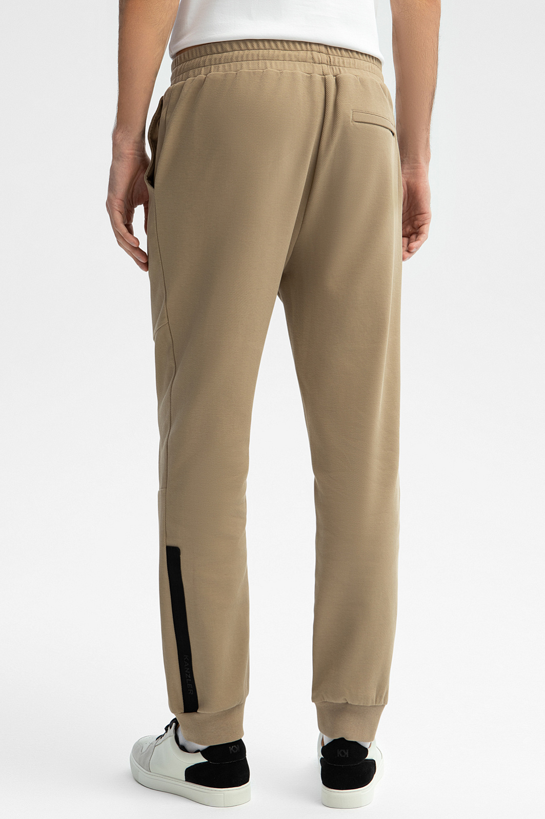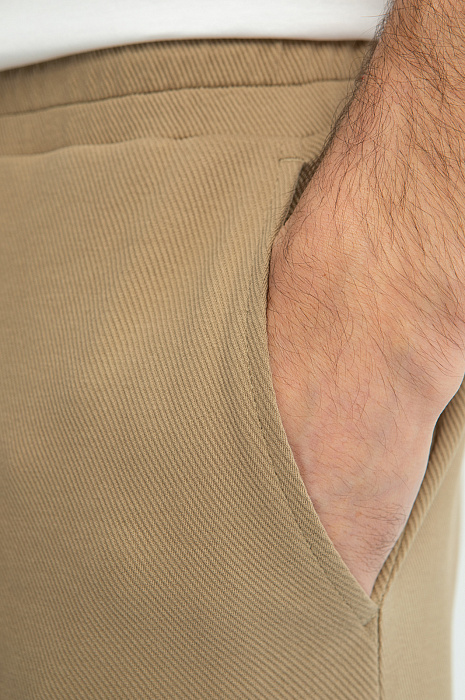 Джоггеры KANZLER из бежевой хлопковой ткани в диагональный рубчик с контрастными деталями предназначены для мужчины, который хочет оставаться стильным и в свободное время. В них удобно гулять в парке, совершать пробежки и предаваться расслабленному отдыху. Свободный крой не сковывает движений. Контрастные детали придают брюкам современный динамичный вид. Резинка с фиксатором позволяет регулировать объем талии. Модель сшита из гипоаллергенного хлопка (89%) с добавлением полиэстера. Дышащий натуральный материал сохраняет естественное тепло тела, не боится капризов погоды и выдержит испытание временем. Параметры модели: рост 192, 101-76-97 Размер на модели: M