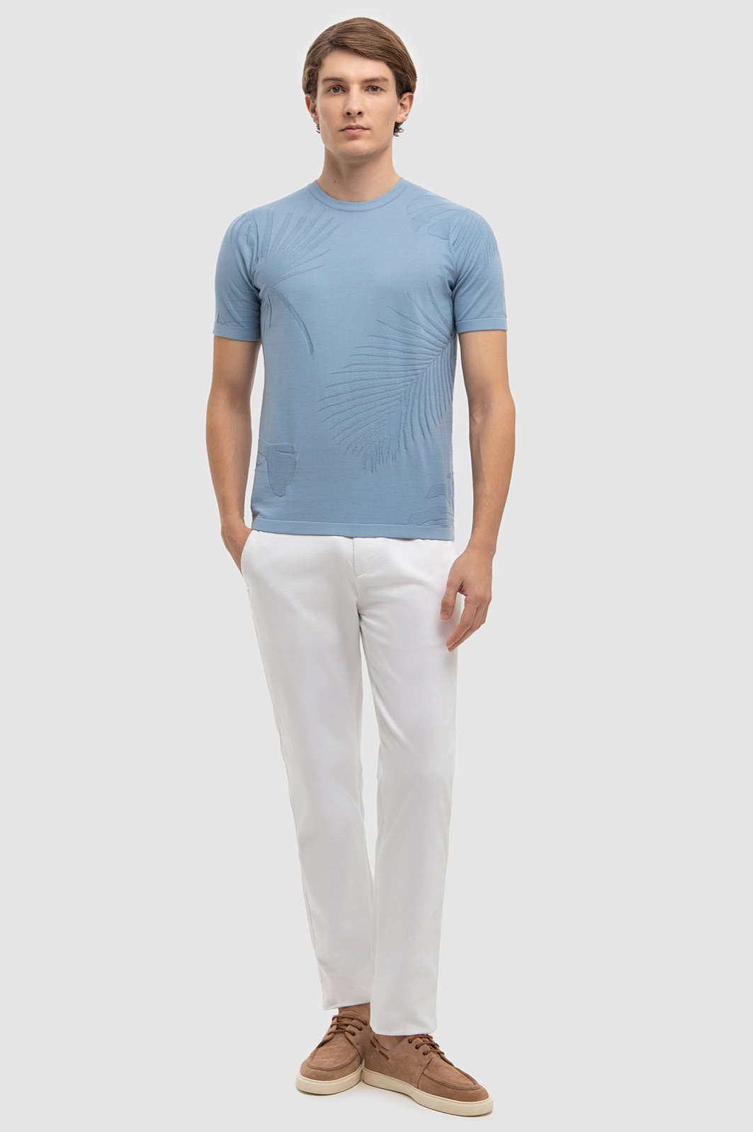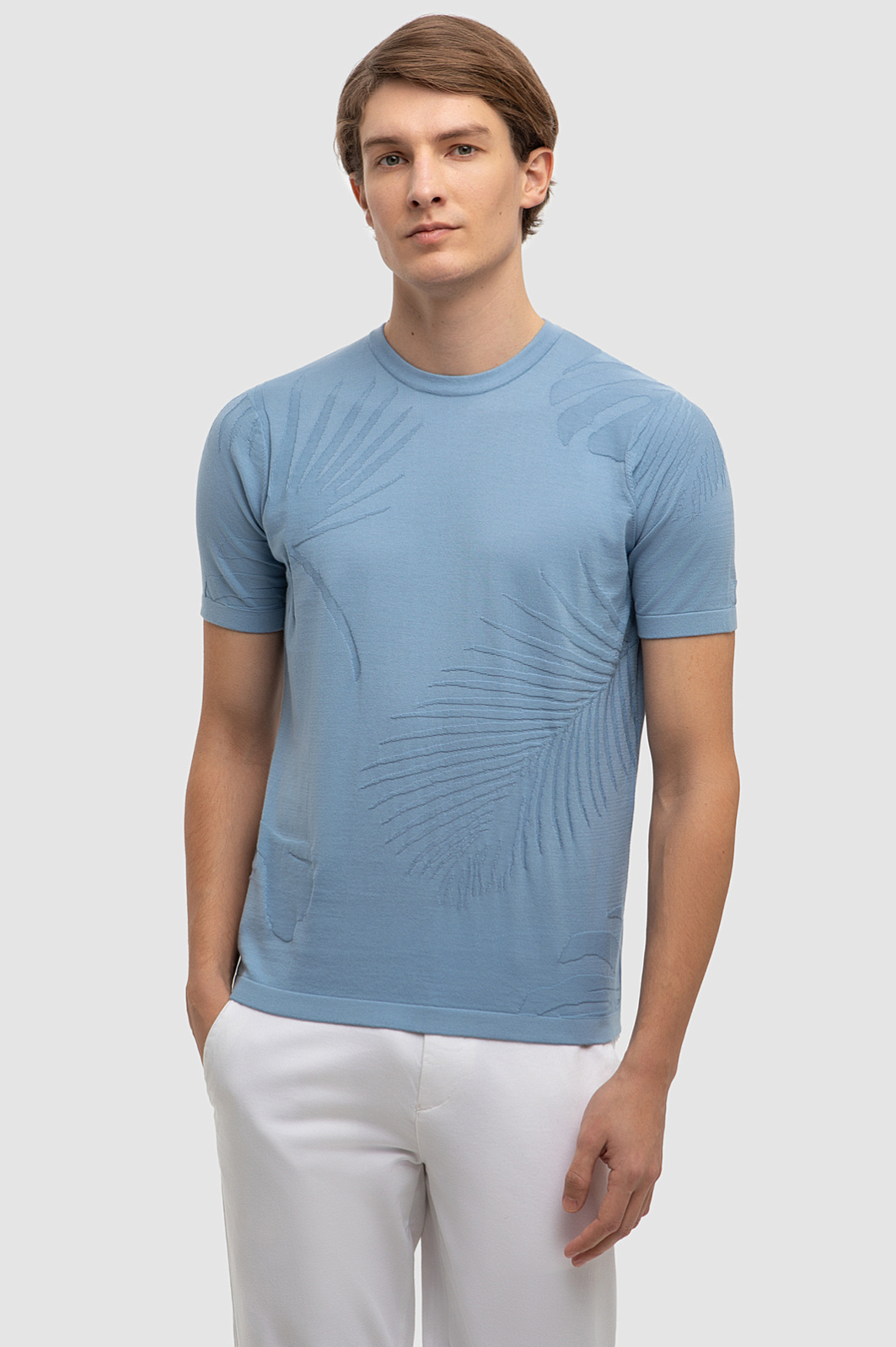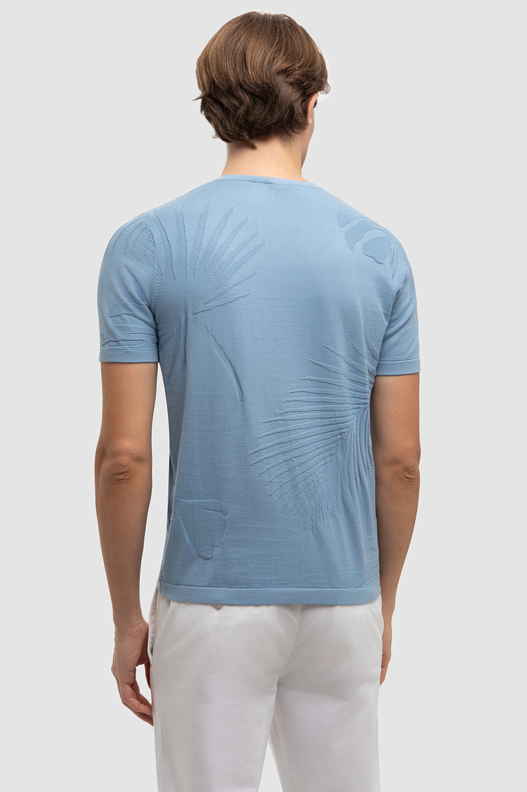 Роскошный голубой матовый оттенок джемпера KANZLER и фактурный ботанический узор из пальмовых листьев навевают мысли о безмятежном отдыхе, создавая расслабленное настроение. 100% премиальный хлопок Пима мягко облегает тело, даря комфорт и ощущение свежести на весь день. Натуральный материал высочайшего качества сохраняет первоначальную форму и цвет даже спустя долгие месяцы - прекрасный выбор для тех, кто ценит в одежде не только стиль, но и функциональность. Модель подойдет как для активных выходных, так и для спокойных дней в офисе с нестрогим дресс-кодом. Наши стилисты предлагают дополнить джемпер светлыми брюками и кожаными лоферами или топсайдерами. Параметры модели: рост 191, 97-77-99 Размер на модели: M