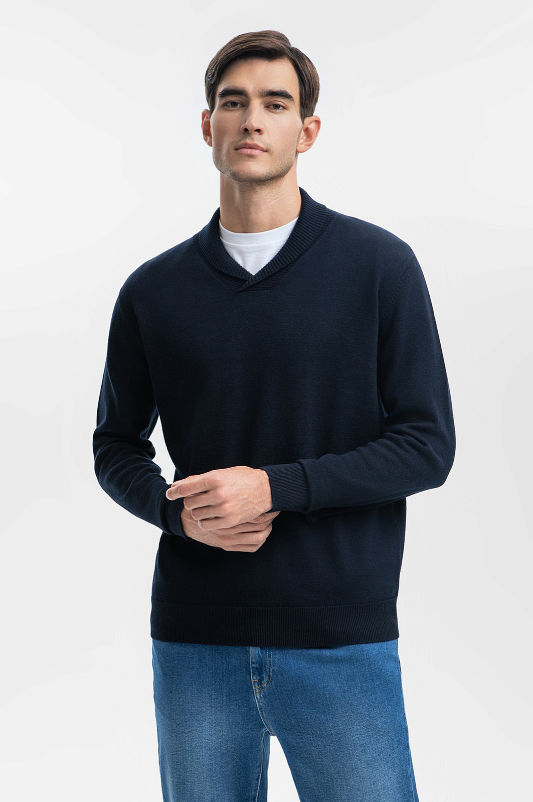 Базовый мужской джемпер KANZLER — образец комфорта и элегантности, который станет незаменимой частью гардероба в любое время года. Премиальный состав ткани, включающий 95% хлопка и 5% кашемира, обеспечивает идеальный баланс между мягкостью и долговечностью. Хлопок делает джемпер дышащим и приятным к телу, а кашемир придает изделию роскошную текстуру. Глубокий Синий оттенок — самый практичный цвет этого сезона, который легко вписывается в различные образы, от кежуал до умный кежуал. Этот цвет подчеркивает сдержанный стиль и лаконичность модели, и позволяет легко сочетать её с классическими брюками, джинсами или брюками. Оригинальный шалевый воротник добавляет джемперу стильный и современный акцент, придавая образу индивидуальности. Джемпер такого кроя легко адаптируется под разные стили, оставаясь одновременно универсальным и выразительным элементом вашего гардероба. Параметры модели: рост 192, 101-76-97 Размер на модели: M