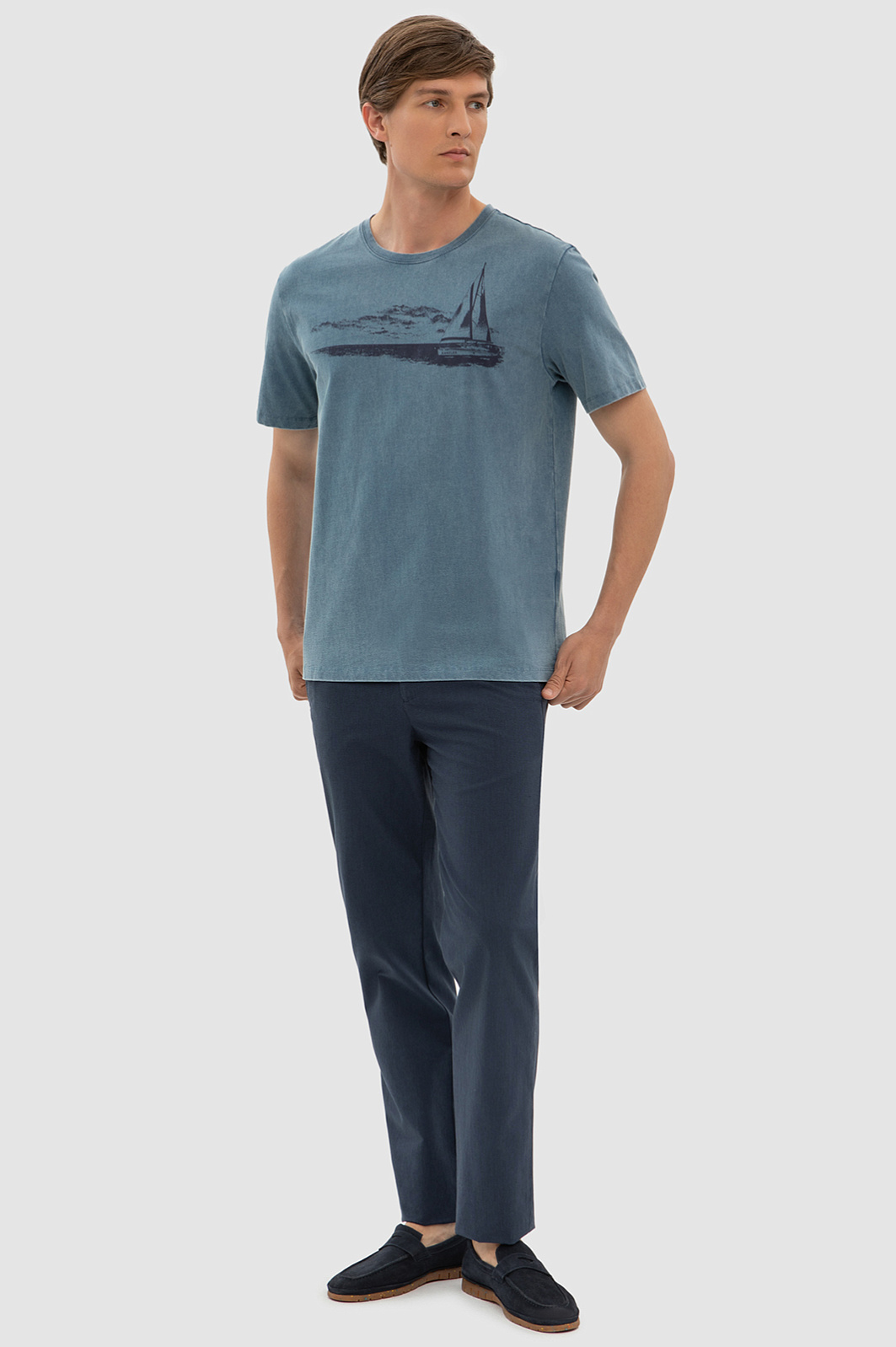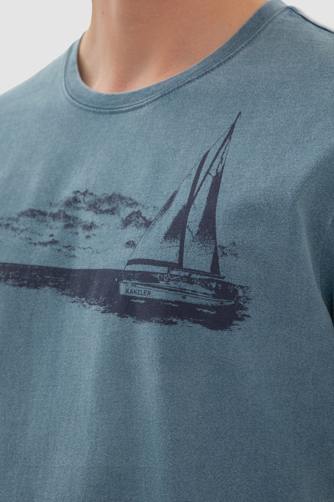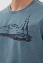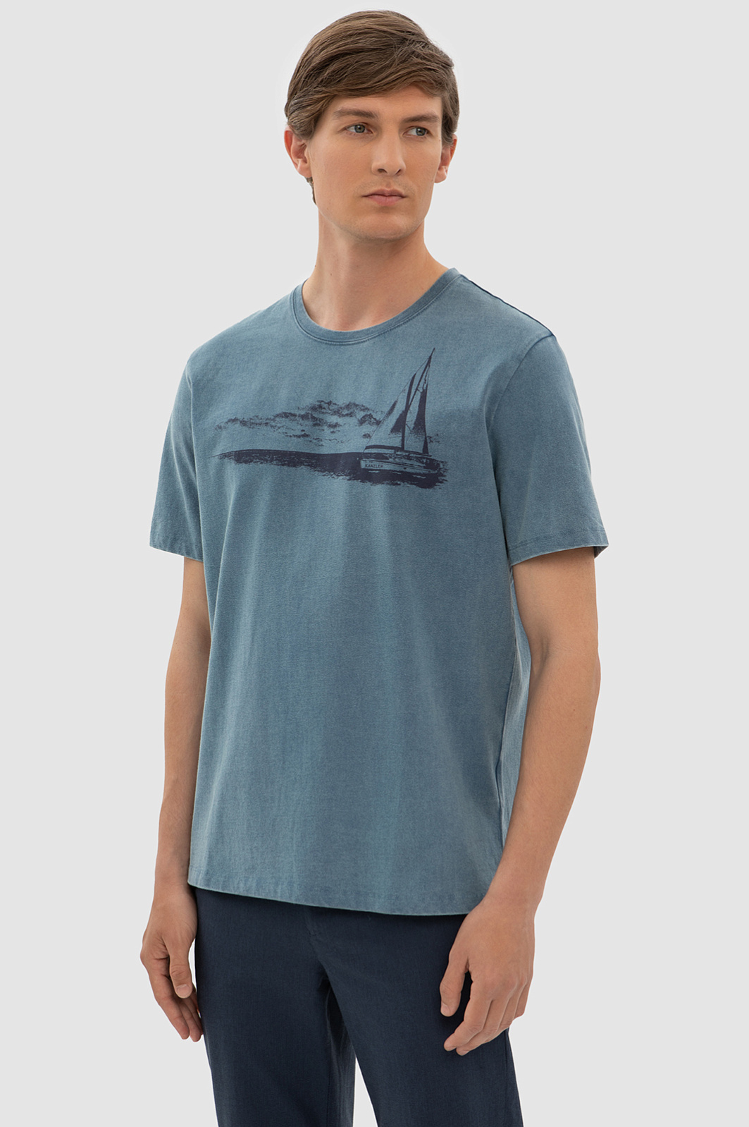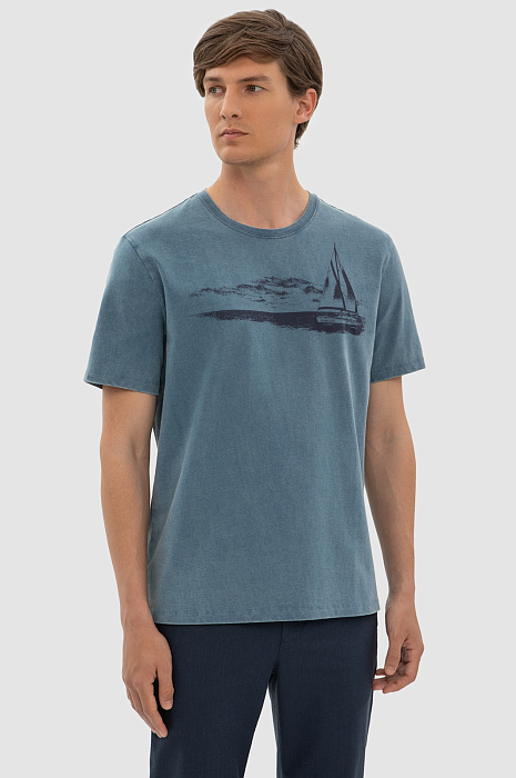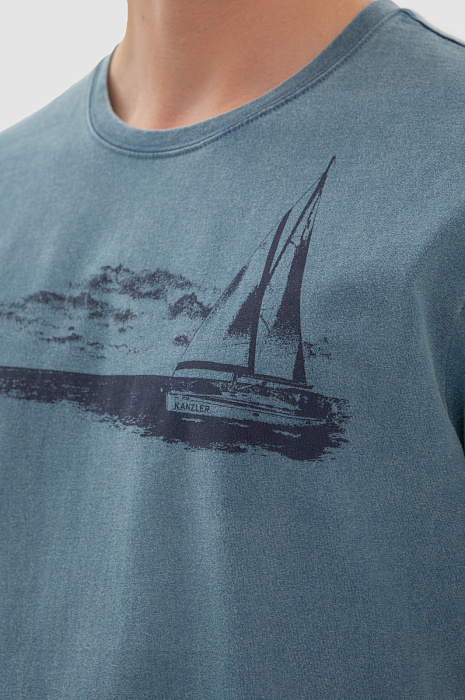 Темно-голубая хлопковая футболка KANZLER украшена морским принтом. Корабль с парусами зовет в неизведанные дали — подальше от будничной суеты, поближе к красоте и природе. Свободный крой футболки подойдет для любого типа фигуры. Сдержанный серо-голубой оттенок сочетается с синими, черными и светлыми джинсам и шортами. Мягкий дышащий материал из чистого хлопка сохраняет тело сухим при активных физических нагрузках и высокой температуре. Ткань не выцветает на солнце, надолго сохраняя первоначальный вид. Параметры модели: рост 191, 97-77-99 Размер на модели: M