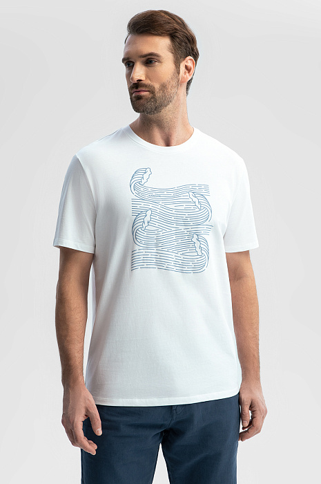 Белая футболка KANZLER с морским принтом – ваш персональный океан, который всегда рядом. Волны, словно застывшие в движении, добавляют образу динамики и вдохновляют отправиться в путешествие. Модель выполнили из экологичного 100-процентного хлопка, нежно обволакивающего кожу. Гипоаллергенный материал обеспечивает комфорт в течение всего дня, не вызывая раздражений. Свободный крой – идеальный выбор для любых летних активностей – сохраняет свободу, не ограничивая движений. Сочетайте модель с брюками для повседневного городского образа или дополните бермудами и сандалиями для прогулки по набережной. Параметры модели: рост 189, 102-80-99 Размер на модели: M