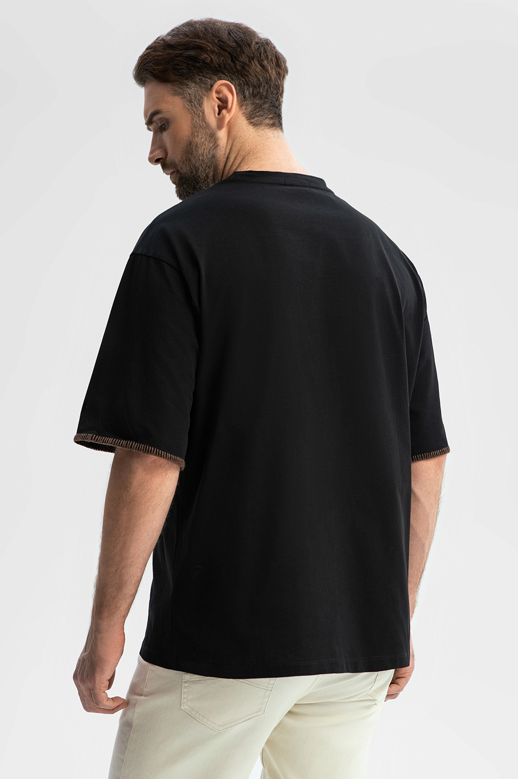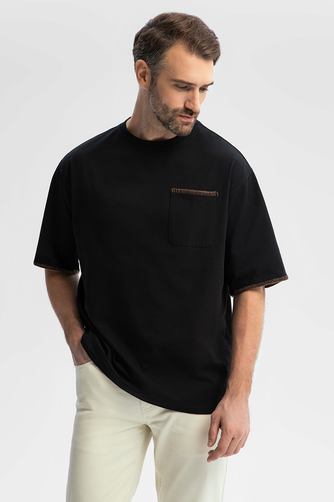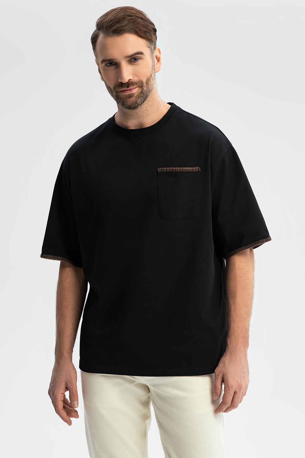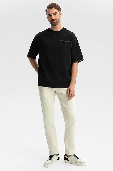 Черная футболка KANZLER оверсайз кроя из чистого хлопка сделает стильным любой повседневный образ. Оригинальность придает коричневый декоративный петельный шов по краю нагрудного кармана и рукавов. Модель отлично сочетается с джинсами и слаксами. Ткань свободно облегает фигуру любой комплекции, не сковывая движений. Гладкий трикотаж из 100-процентного гипоаллергенного хлопка — настоящий праздник для тела. Мягкие натуральные волокна не раздражают даже самую чувствительную кожу, поддерживают комфортную температуру и свежесть. Параметры модели: рост 189, 102-80-99 Размер на модели: M
