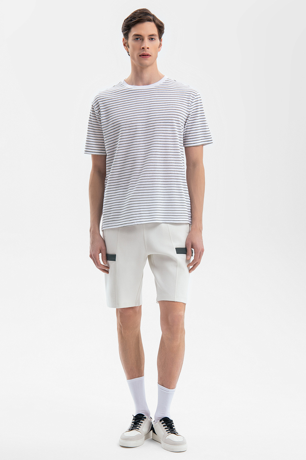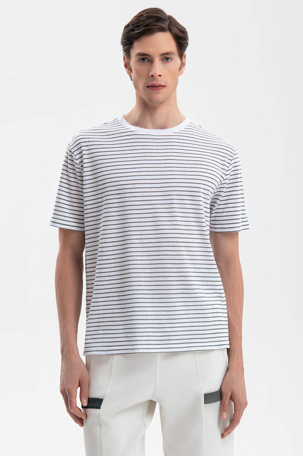 Футболка KANZLER в полоску – формула вашего комфорта. Свободный крой, экологичный долговечный материал и универсальный фасон – модель будет радовать своим качеством на протяжении многих сезонов. Для ее создания выбрали материал, объединивший лучшие свойства льна и хлопка: мягкая ткань отлично сохраняет форму, не растягиваясь, и сохраняет комфорт в жаркий день – гигроскопичная ткань быстро впитывает влагу и дарит ощущение прохлады. Свободный крой обеспечивает абсолютную свободу движения. Сочетайте футболку с оливковыми бермудами и эспадрильями или дополните темно-синими джинсами и кедами для городского образа. Параметры модели: рост 189, 91-78-95 Размер на модели: М