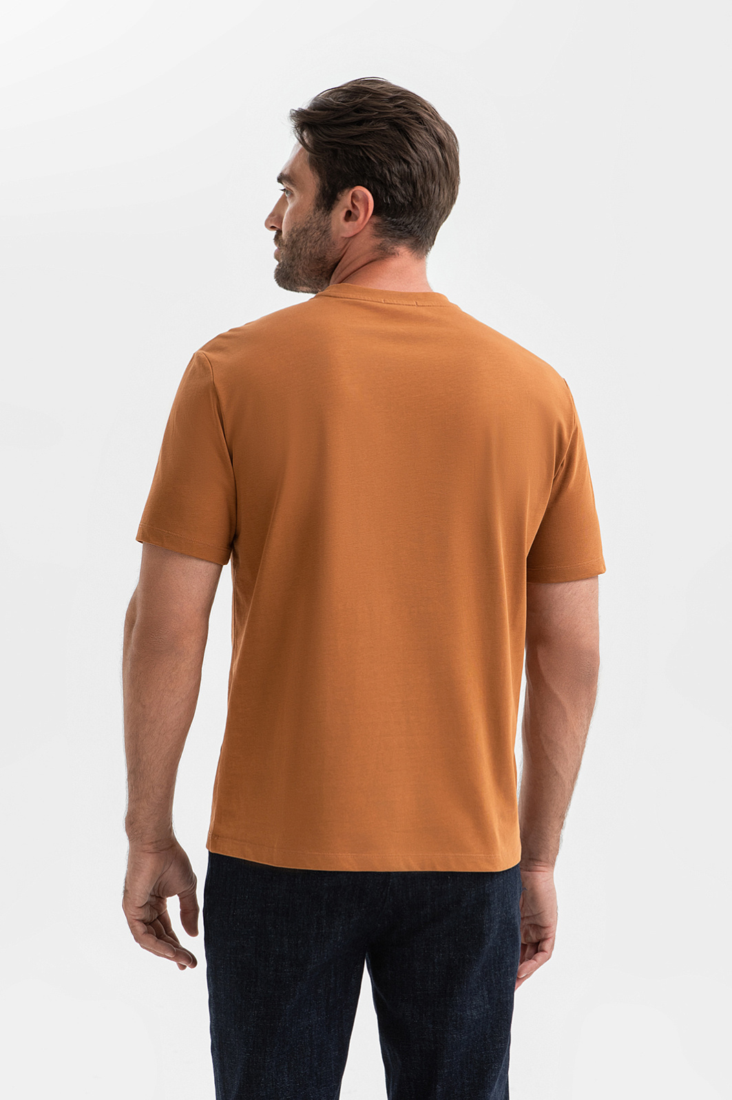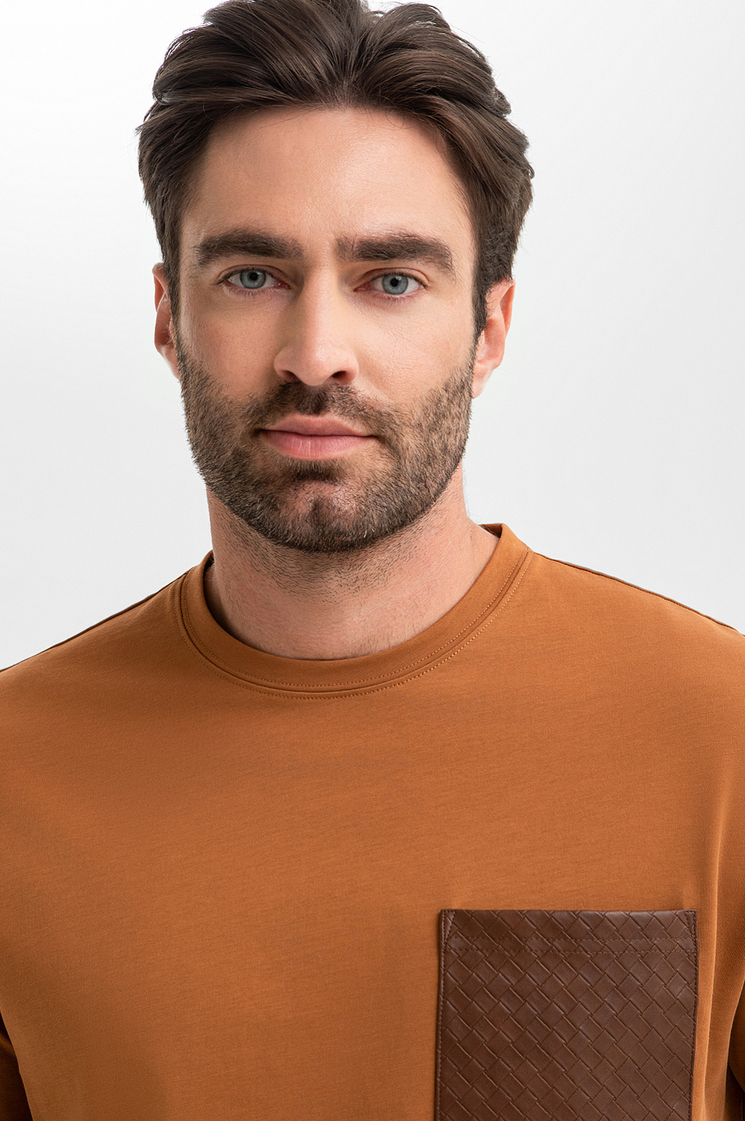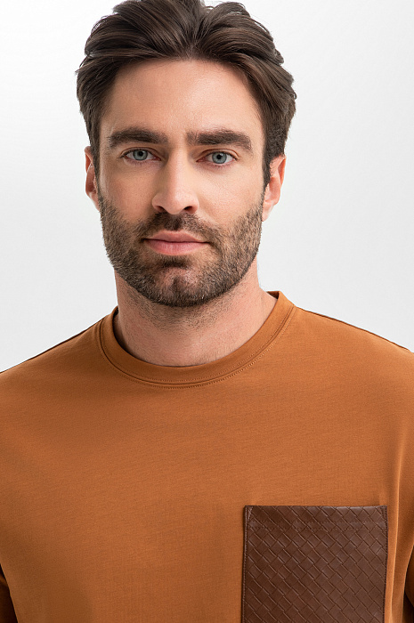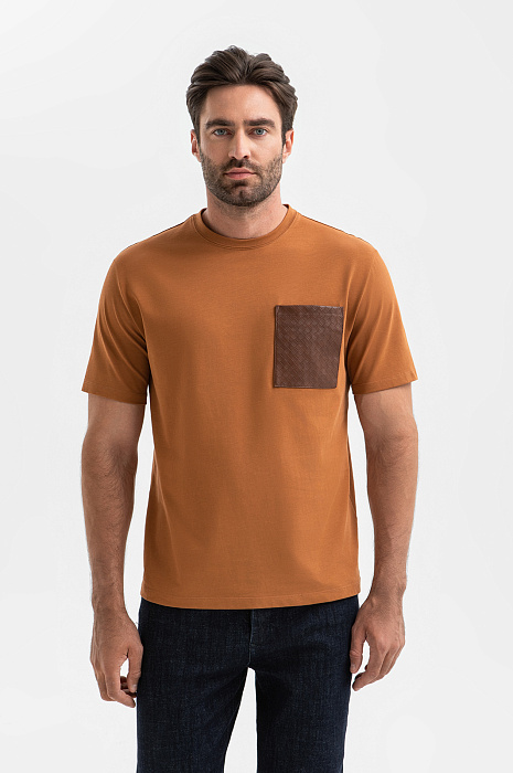 Футболка KANZLER свободного кроя с классическим круглым вырезом из хлопка (100%) — удобная универсальная модель для любого сезона, которую легко представить и в повседневных образах, и в элегантном ансамбле в стиле кежуал. Идеальный баланс лаконичности, качества и изысканности. Тёплый охристый оттенок добавляет образу глубины. В качестве акцента выступает нагрудный карман из коричневой фактурной ткани, который придаёт модели современный городской вид. Футболка выполнена из мягкого натурального хлопкового трикотажа безупречного качества, который отличается мягкостью и воздухопроницаемой структурой. Параметры модели: рост 192, 108-83-102 Размер на модели: M