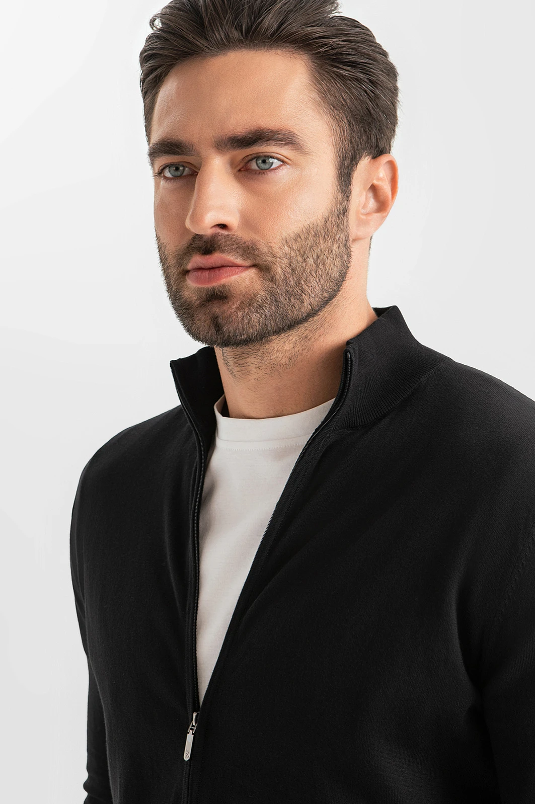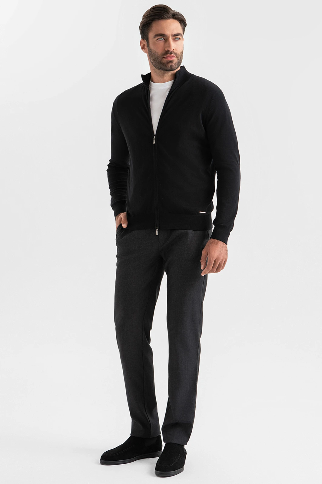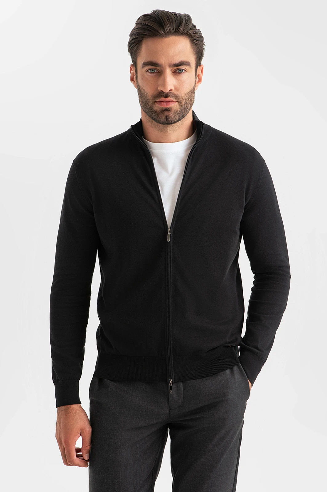 В классическую коллекцию базовой одежды вошел черный кардиган на молнии. Дизайнеры изготовили модель из мягкого эластичного хлопка. Повседневный образ поддержат белая футболка, прямые джинсы и кроссовки цвета гречишного меда. Черный кардиган из нежного хлопка — универсальная база гардероба, которая станет незаменимым элементом осенне-зимних образов, добавит элегантности и стиля, оставаясь нейтральной основой для ярких акцентов. Натуральный хлопковый состав обеспечивает комфорт и дышащие свойства, что делает кардиган приятным на ощупь и удобным в носке в течение всего дня. Резинка внизу кардигана аккуратно подчеркивает силуэт. Параметры модели: рост 192, 108-83-102 Размер на модели: M