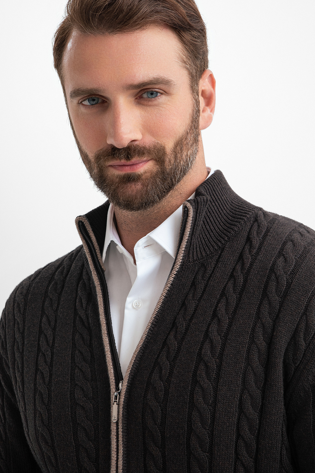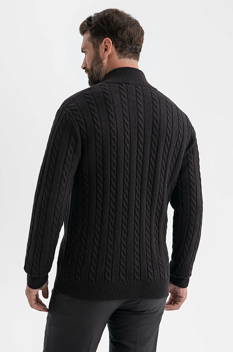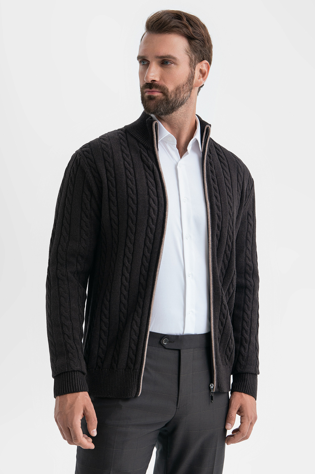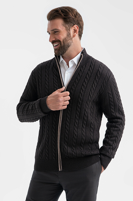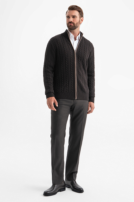 Коричневый кардиган KANZLER на молнии из хлопка и кашемира с объемными вертикальными косами — нарядная и уютная вещь, которая сделана с теплотой и заботой о Вашем комфорте. Модель смотрится безупречно и стильно, в том числе, и с деловой одеждой — офисными брюками и рубашками. Спокойствие коричневого цвета сочетается с мягкостью линий, декоративной вязкой и контрастной светло-серой полосой вдоль молнии. Теплый качественный трикотаж объединяет достоинства легкого воздушного хлопка и нежного кашемира. Ткань отлично сохраняет тепло в холодные дни, не допуская перегревания, и создает ощущение мягкого заботливого прикосновения.