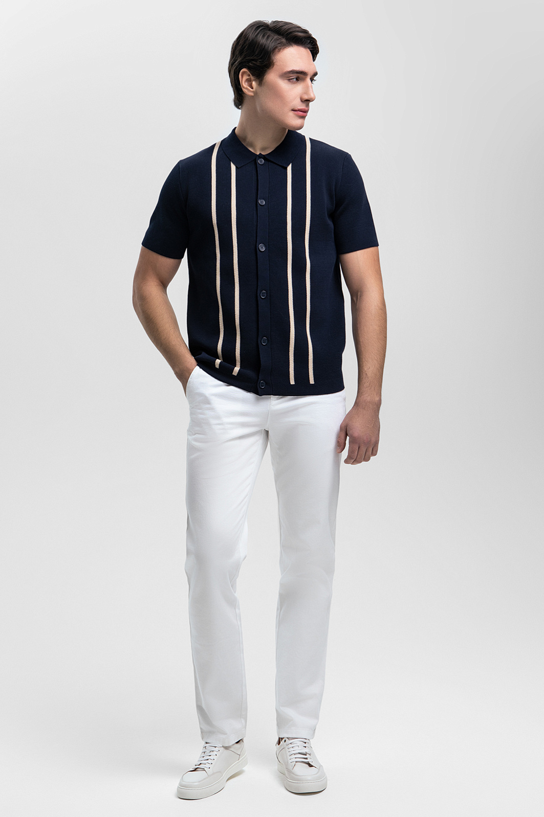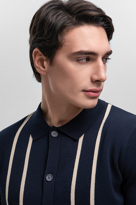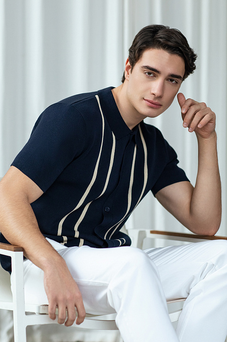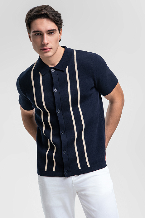 Темно-синий кардиган KANZLER станет акцентом стильного и утонченного образа. Модель выполнена из 100% хлопка, мягкого и долговечного. Натуральный материал подходит даже самой чувствительной коже, дарит невероятный комфорт и обеспечивает воздухообмен, что делает его идеальным выбором для теплых дней. Вертикальные бежевые полосы, словно линии на картине, добавляют выразительности и создают эффект стройности, визуально вытягивая силуэт. Отложной воротник и пуговицы придают модели завершенный и изысканный вид. Стилисты предлагают дополнить образ светлыми брюками и обувью из натуральной кожи. Параметры модели: рост 190, 103-83-99 Размер на модели: M
