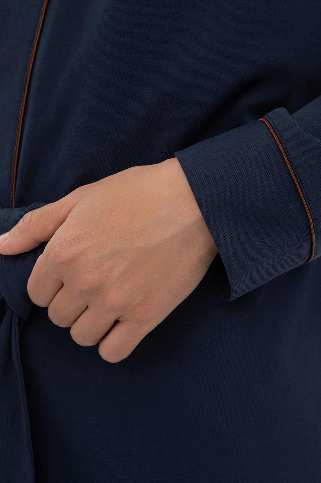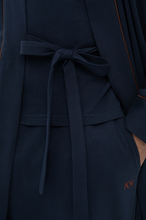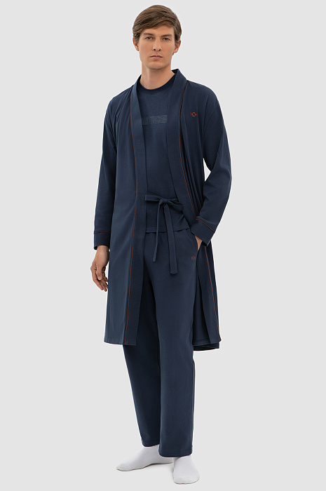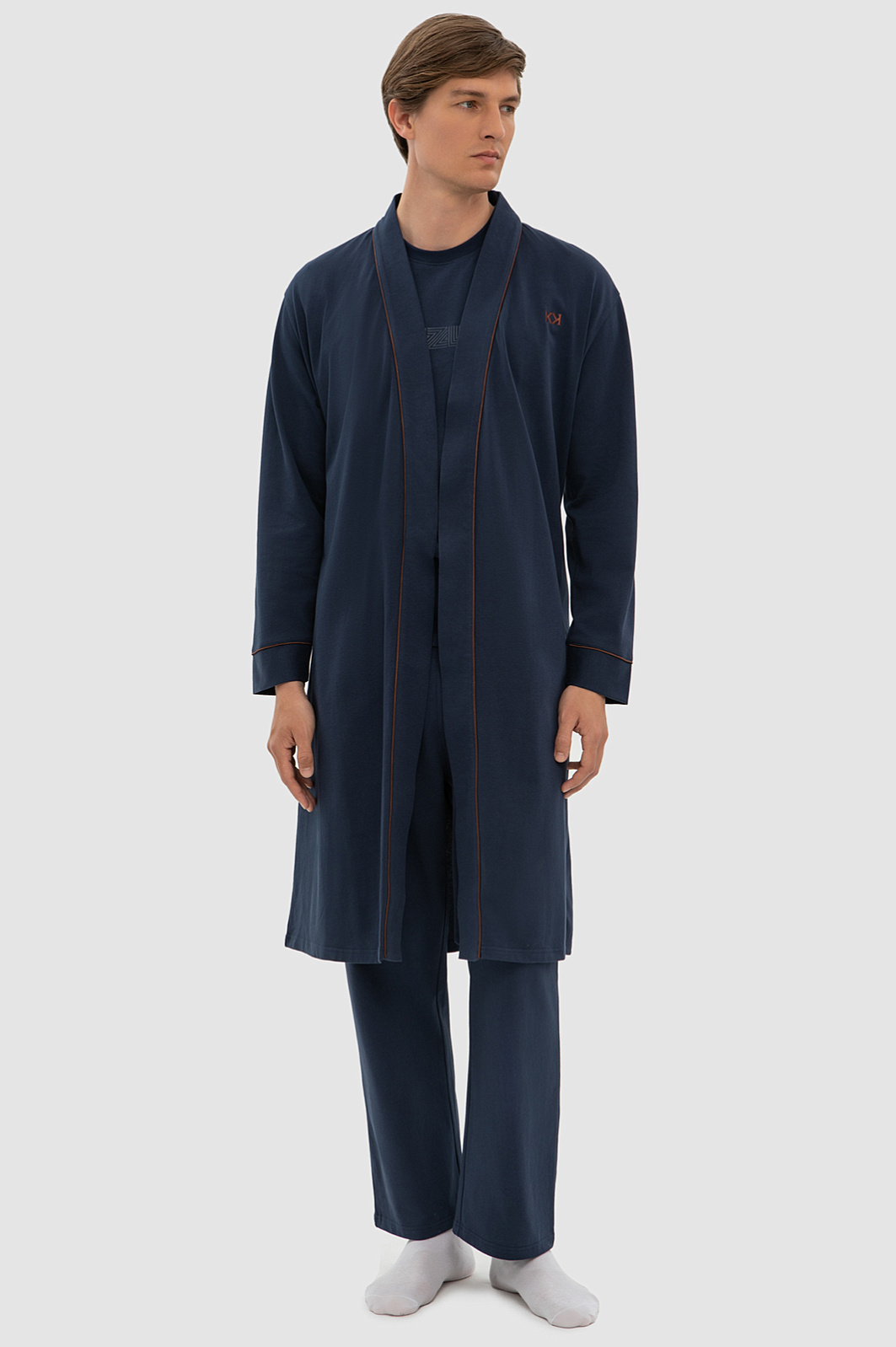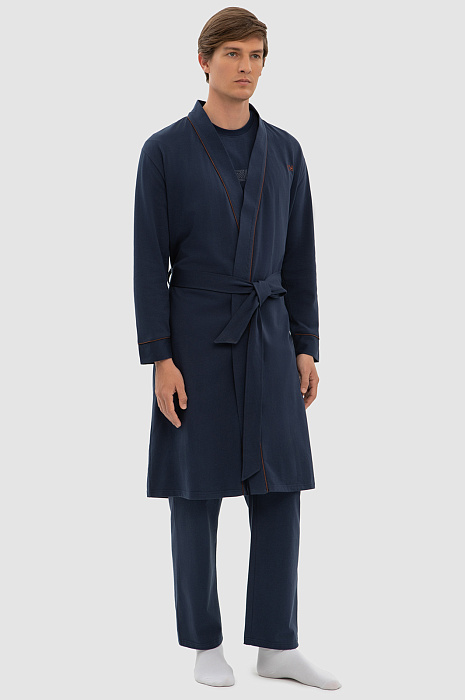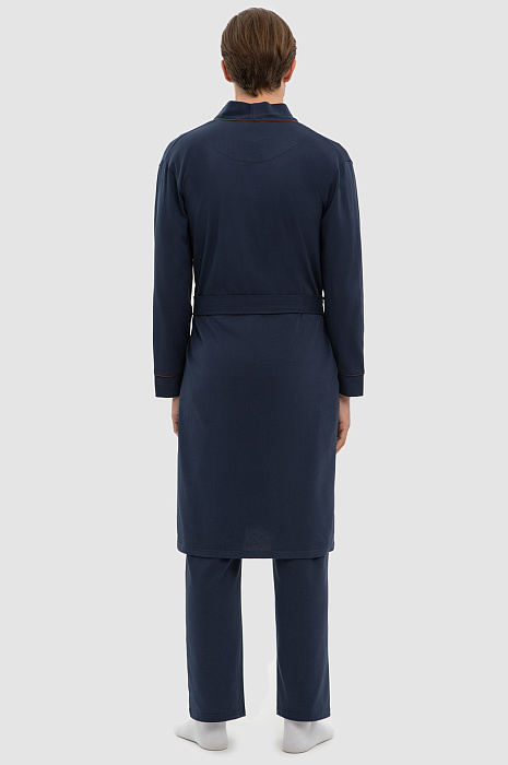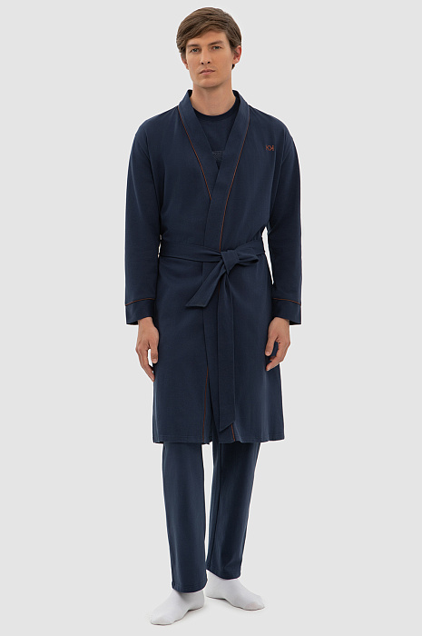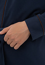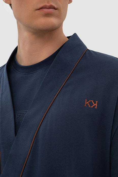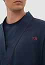 Халат из хлопка KANZLER в оттенке navy blue выполнили из 100-процентного хлопка. Спокойный оттенок настраивает на волну безмятежности, а натуральный материал дарит ощущение комфорта. Нежные гипоаллергенные волокна хлопка отлично впитывают влагу, пропускают воздух и приятно ощущаются на коже. Регулируемый пояс на талии обеспечивает свободу движения и удобную посадку. Модель декорирована небольшой вышивкой с логотипом бренда. Во время домашнего отдыха, после тренировки, душа или бассейна – халат станет элегантным отражением вашего безупречного стиля в любой обстановке.