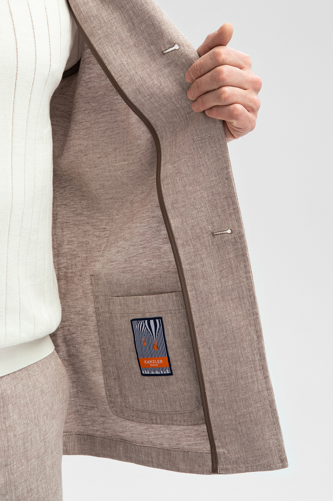 Микс классических и спортивных деталей в светло-бежевом костюме KANZLER из хлопка и льна выглядит стильно и оригинально. Небольшими акцентами на светлом фоне служат пуговицы шоколадного оттенка. Пара составлена из облегченного пиджака с манжетой на пуговицах и аккуратными накладными карманами, который может выполнять функцию «второй рубашки», и удобных брюк на кулиске. Натуральный смесовый материал полотняного переплетения, созданный из легкого воздушного хлопка и прочного износоустойчивого льна, — наилучший выбор для теплого сезона. Ткань сохраняет оптимальную для тела температуру и создает ощущение прохлады в жаркие дни.