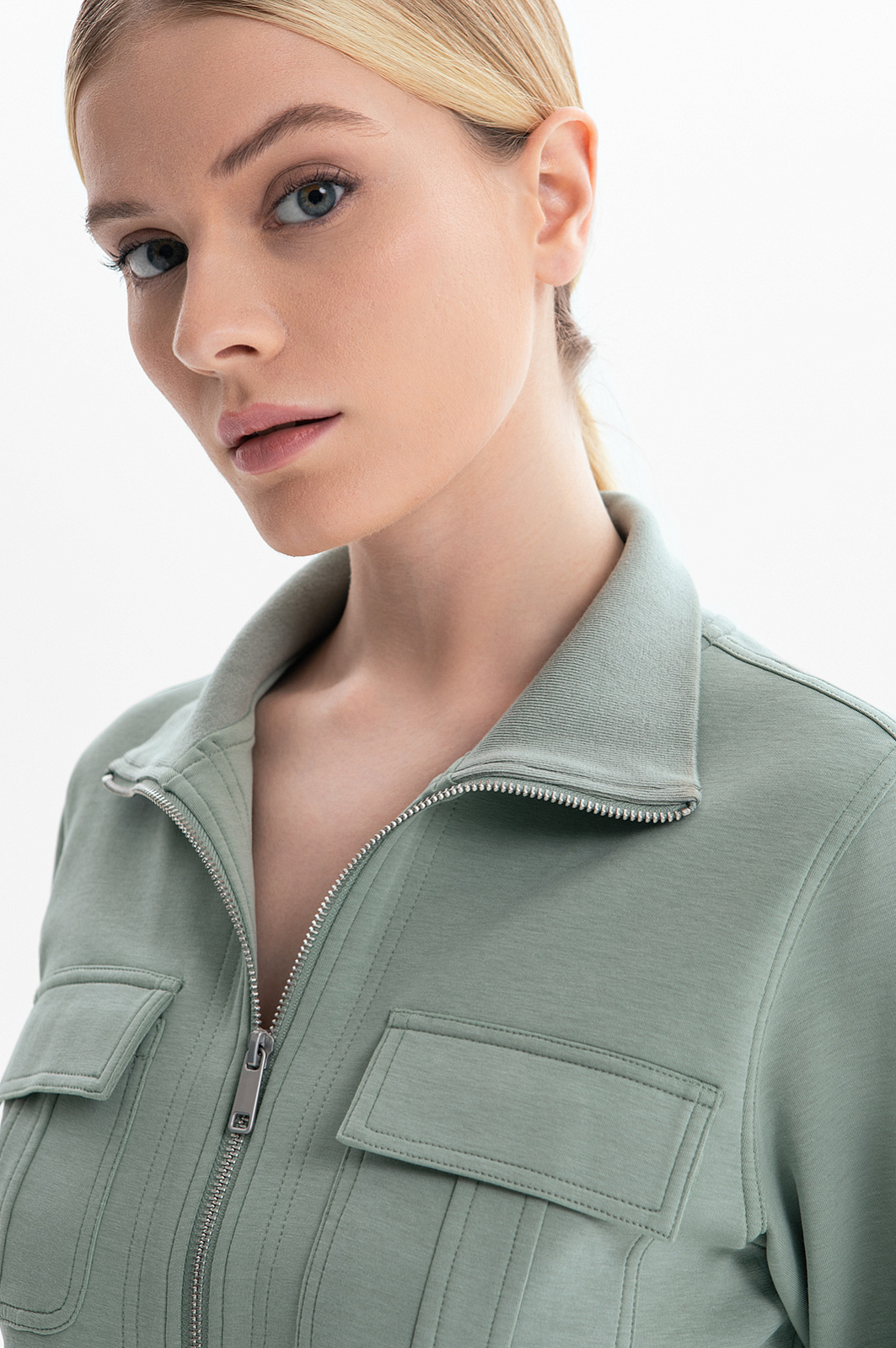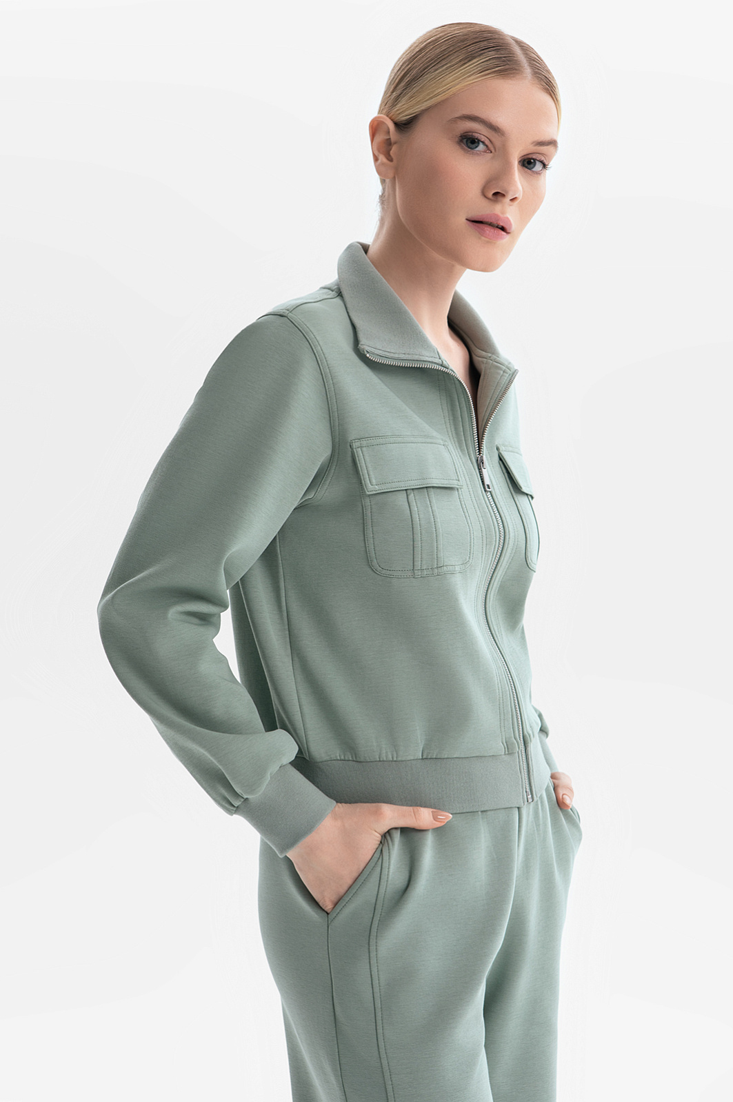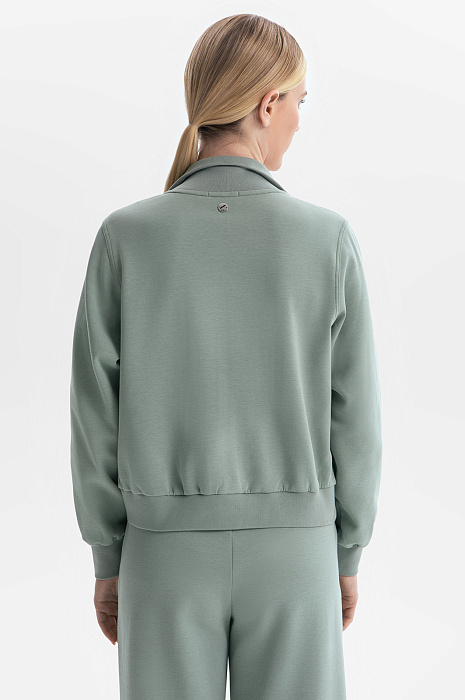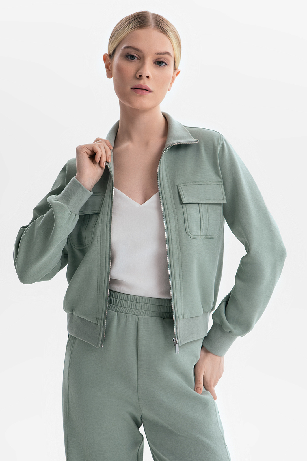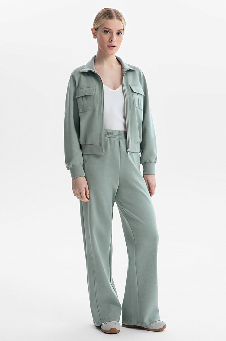 Отдавая должное актуальному спортивному стилю, дизайнеры создали нежно-оливковый трикотажный костюм KANZLER. В нем можно совершить элегантный забег по делам, отправиться за покупками и просто погулять по улице. Костюм состоит из короткой куртки на молнии с широкими трикотажными резинками и свободных брюк А-образного силуэта с поясом-резинкой. Мягкий характер хлопкового трикотажа сочетается с геометрически выверенными деталями — отделочными швами и накладными карманами с клапаном. Качественный плотный трикотаж сделан из дышащего гипоаллергенного хлопка с добавлением волокон полиэстера и спандекса, которые необходимы для прочности и эластичности.