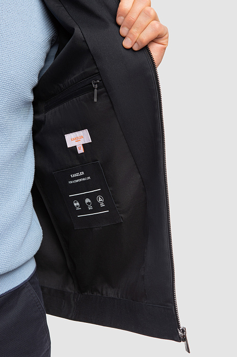 Стильный темно-синий бомбер KANZLER — союз элегантного минимализма, практичности и комфорта. Такая куртка отлично впишется в гардероб любителей спортивного стиля и активного образа жизни. Небольшие детали — застежка-кнопка на воротнике, язычки на молниях из белого металла, а также неброский фирменный инициал на груди — придают модели шика. Застежки сзади, внизу, и на манжетах служат для регулирования прилегания краев куртки. Современная прочная ткань из полиэстера с небольшим добавлением спандекса отлично держит форму, не мнется и устойчива к капризам погоды. Подкладка из практичного смесового материала (полиэстер и хлопок) обеспечивает комфорт и воздухообмен.