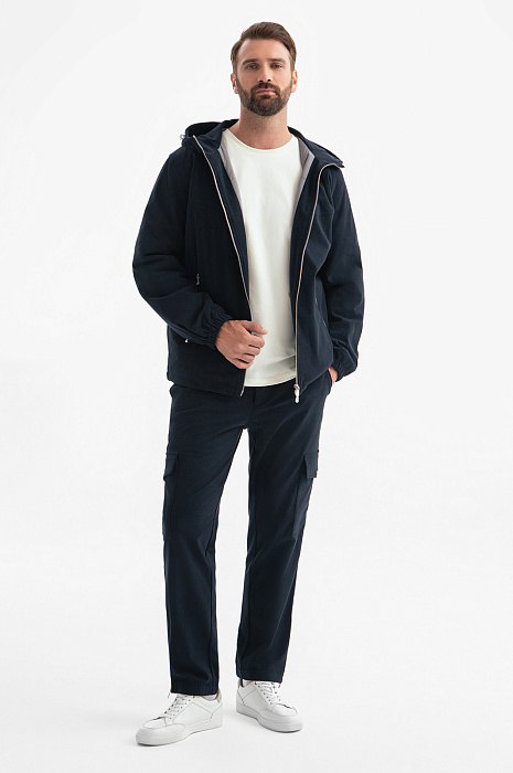 Куртка с капюшоном Limited Edition - воплощение стиля и комфорта. Модель с функциональными карманами сшита из высококачественного хлопкового вельвета с текстурой, придающей глубину и насыщенность оттенку navy. Вельвет известен своей прочностью и способностью удерживать тепло, что делает его идеальным для прохладной погоды. Внутренняя стежка сохраняет тепло, а регулируемый капюшон обеспечивает дополнительную защиту от ветра, добавляя модели спортивный характер. Спортивная куртка застегивается на металлическую молнию, которая придает брутальность изделию. Для завершения образа сочетайте куртку с брюками-карго с накладными карманами — получится идеальный комплект для активных будней и прогулок.