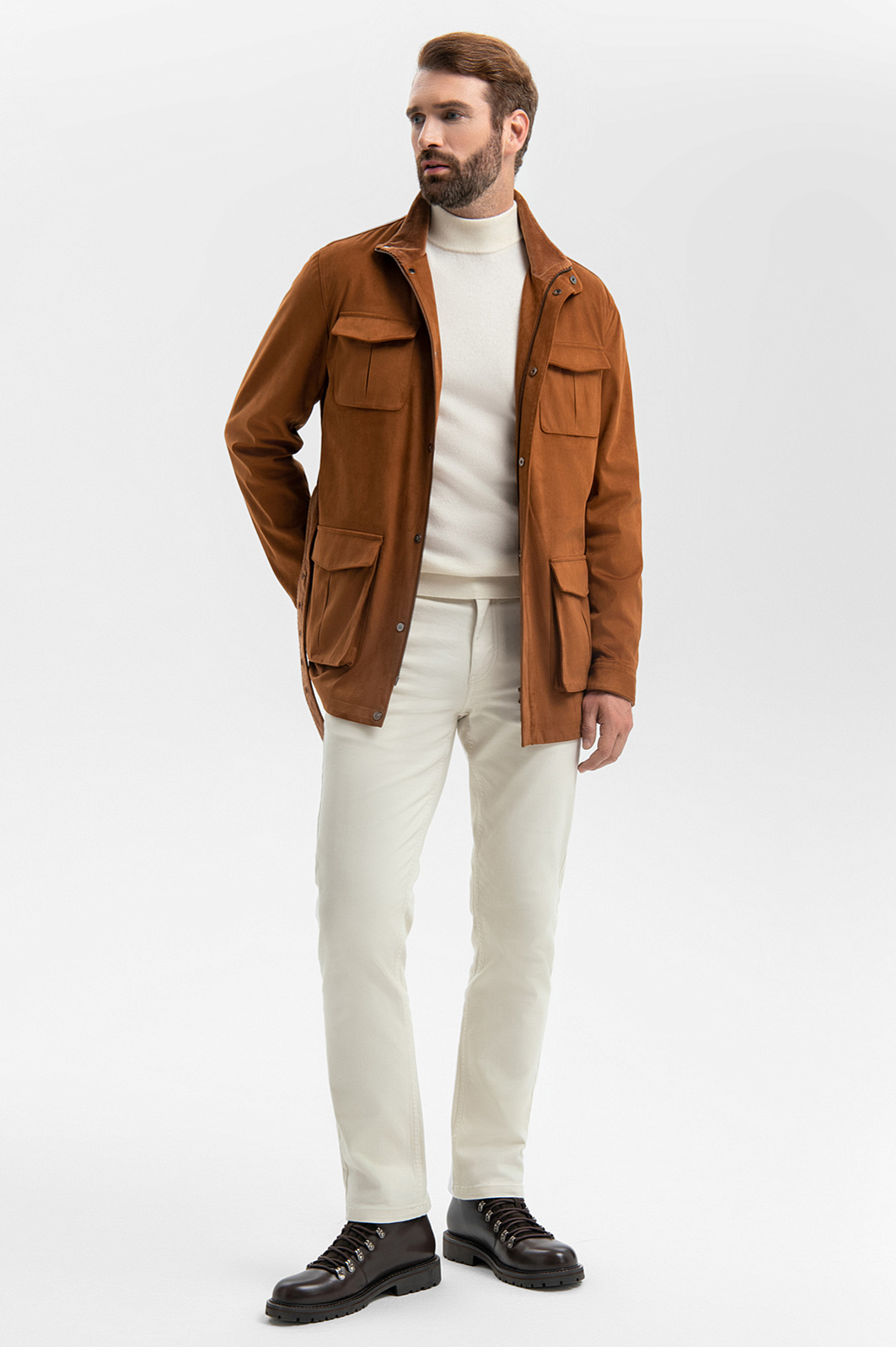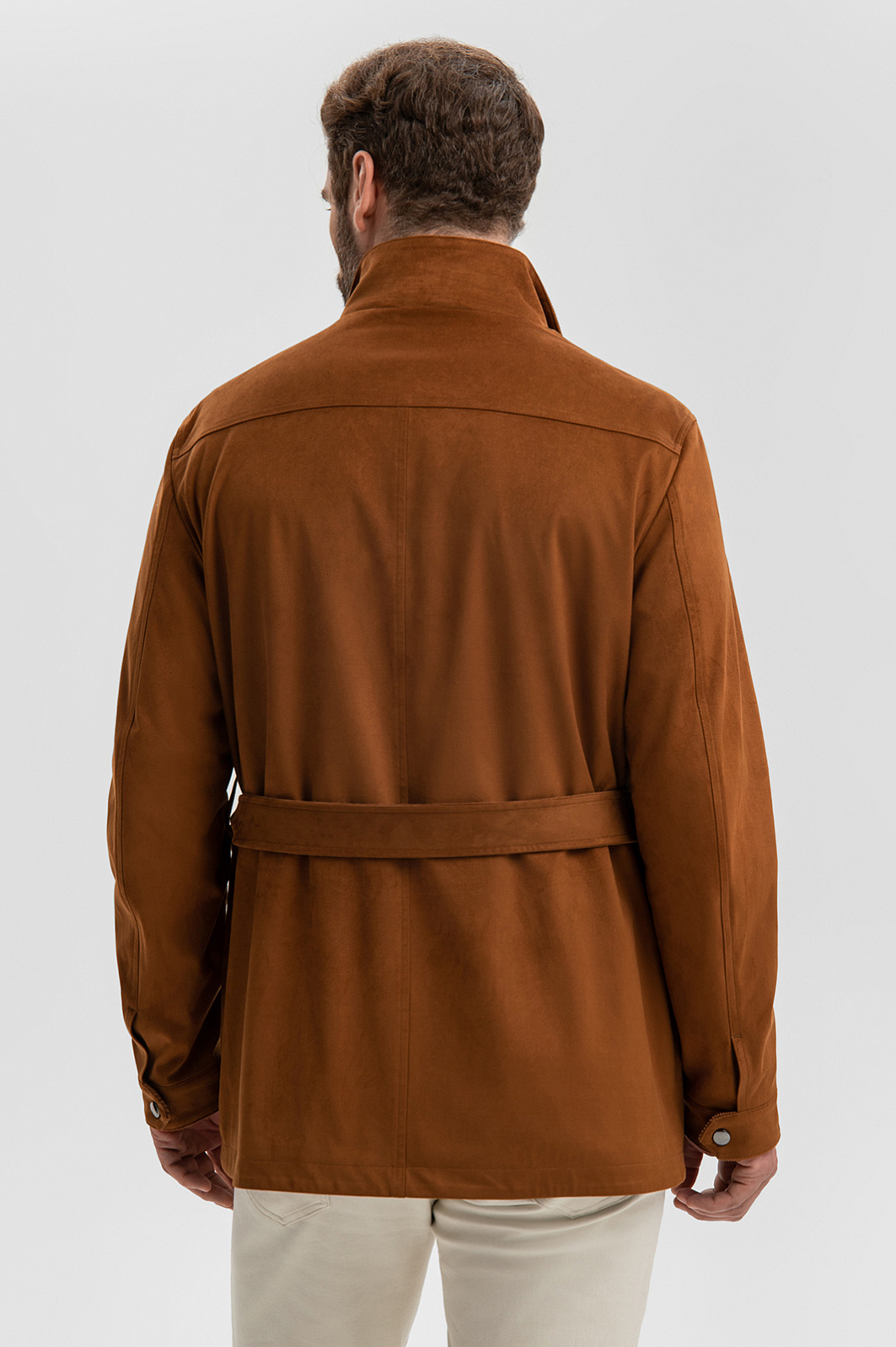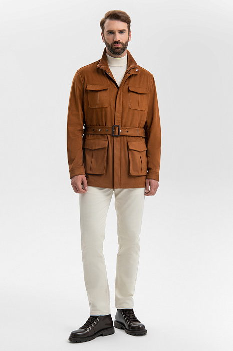 Куртка KANZLER из алькантары красивого оттенка мокко — современная версия куртки-сафари, которая приобрела культовый статус. Модель сохранила характерные черты: четыре больших накладных кармана, пояс-ремень и воротник-стойку. У куртки слегка прилегающий силуэт, вельветовая вставка на воротнике и удобная застежка-молния, скрытая под планкой с кнопками. Материал верха — алькантара. Мягкая, бархатистая ткань не лоснится, не протирается и годами сохраняет первоначальный вид и форму. Параметры модели: рост 189, 102-80-99 Размер на модели: 50