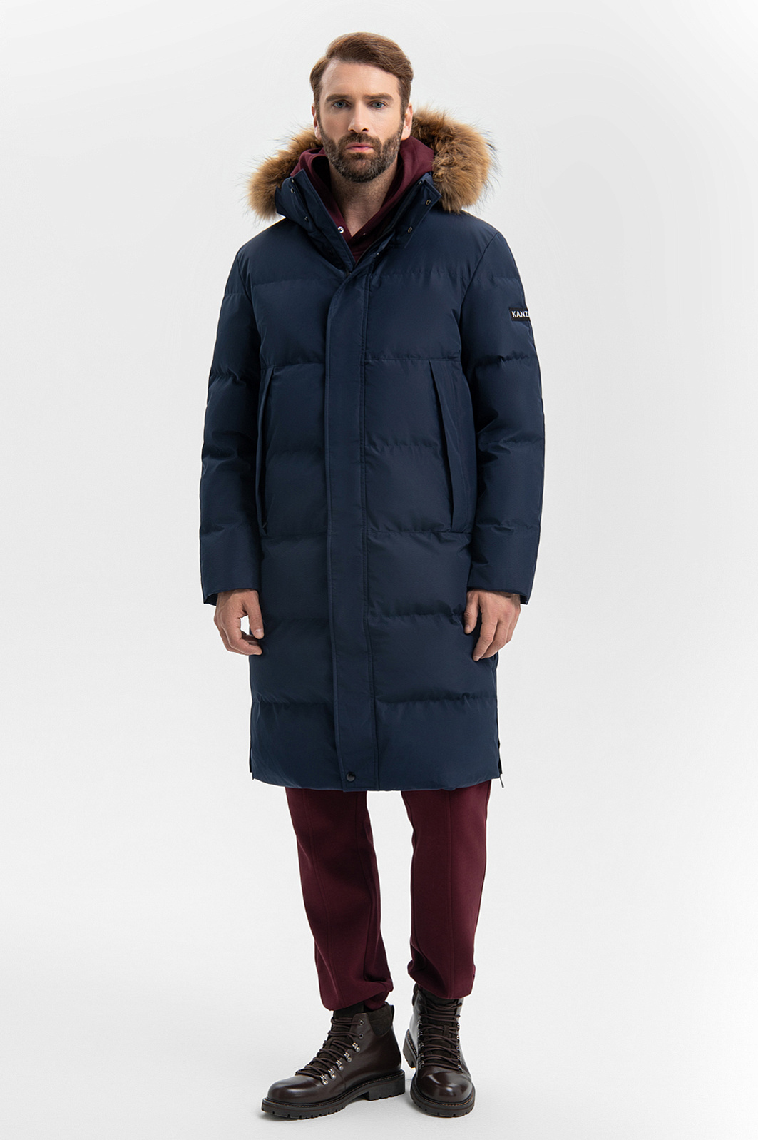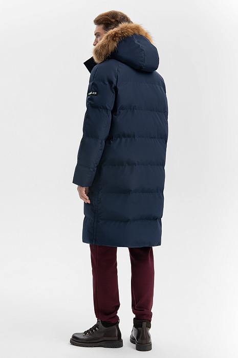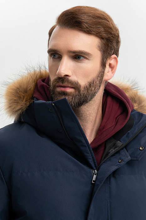 Практичная тёмно-синяя удлинённая куртка KANZLER — верная спутница городских прогулок, загородных поездок и зимних приключений, созданная для комфорта, тепла и хорошего настроения в холодные дни. Она сочетает в себе лаконичность и функциональность, продуманную до мелочей. Высокий воротник и планка с кнопками, прикрывающая застёжку-молнию, надёжно защищают от пронизывающего ветра, а капюшон с меховой отделкой добавляет образу мужественности. Ткань верха с водоотталкивающей пропиткой защищают от дождя и снега. Наполнитель из лёгкого полиэстера удерживает тепло, создавая ощущение уюта даже в морозную погоду., Параметры модели: рост 189, 102-80-99 Размер на модели: 50