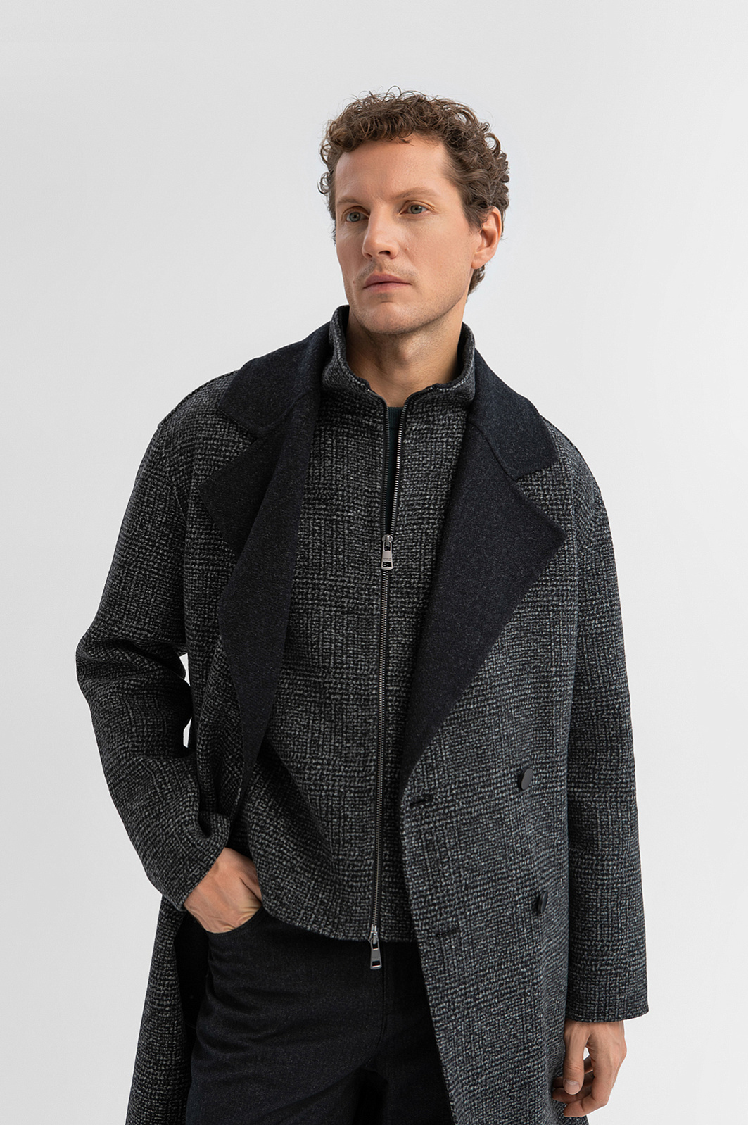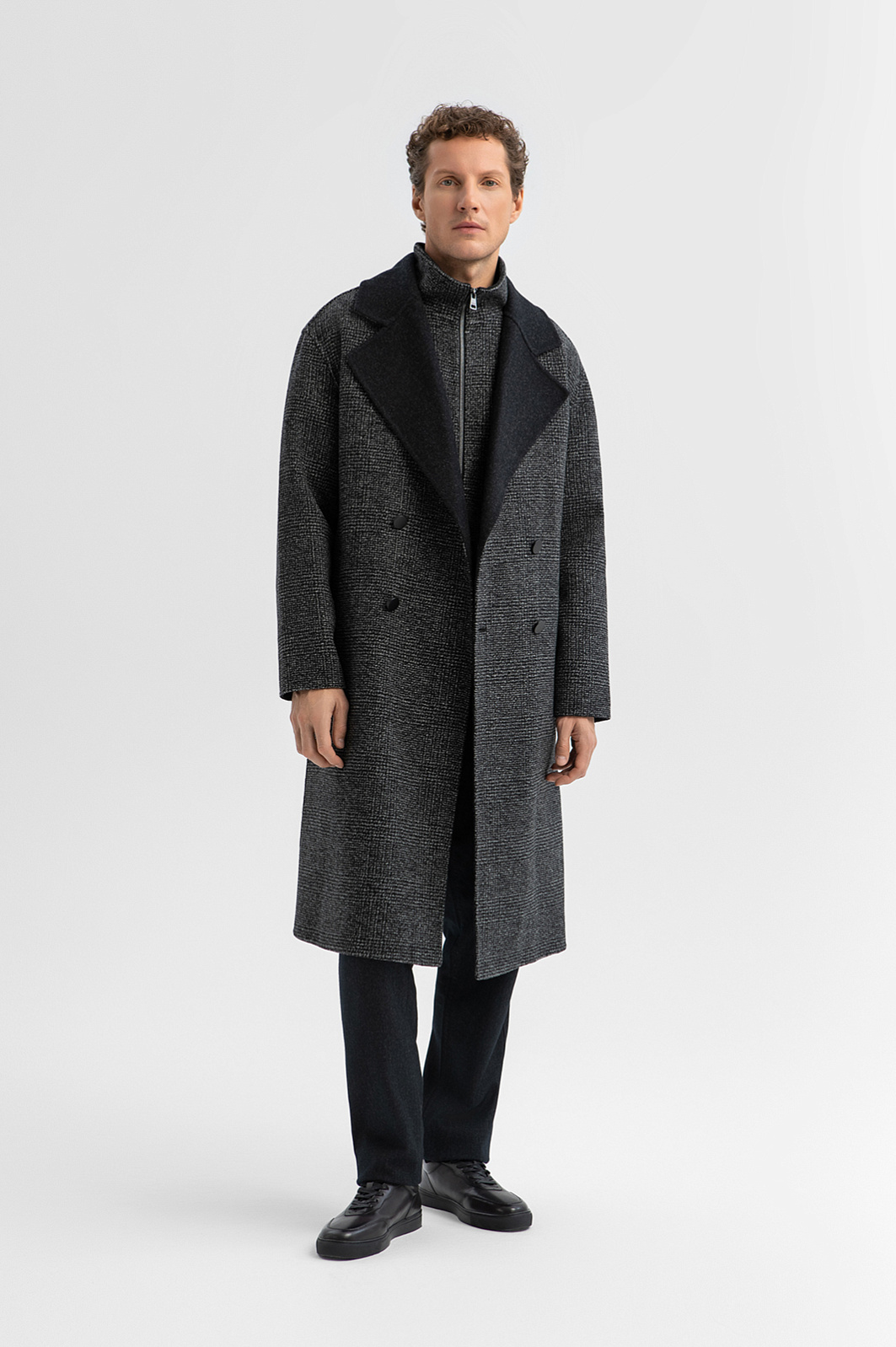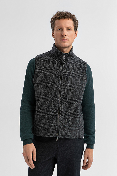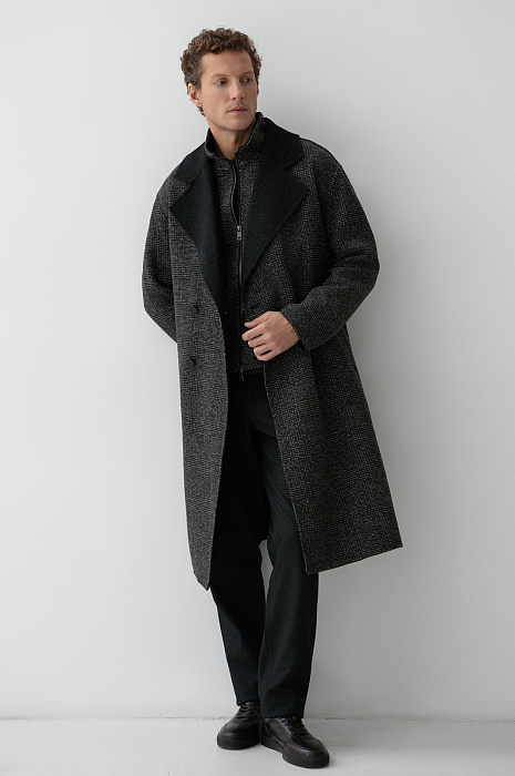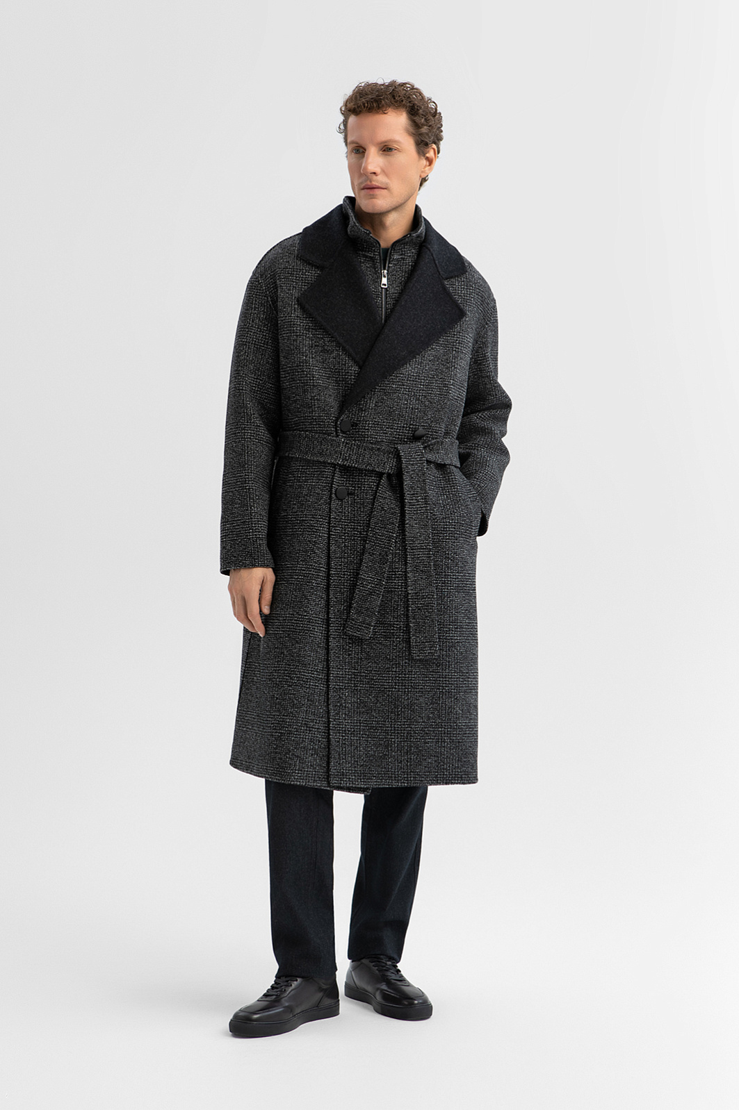 Двубортное пальто KANZLER в мелкую черную клетку из смесовой шерсти прямого кроя с поясом — результат современного подхода к дизайну, основанного на формуле: городской стиль + уникальность + функциональность. Это трансформируемая модель «два в одном», элементы которой (пальто и жилет) можно носить вместе и по отдельности, а пальто — с поясом и без. Двубортная застёжка и широкие чёрные лацканы придают образу основательность и архитектурную чёткость, а кокетка на спинке, отсылающая к силуэту плаща, добавляет динамики. Внутри — аккуратный жилет с высоким горлом на двухзамковой молнии. Мелкая черная клетка на ткани придает модели сдержанность. Материал из смесовой шерсти (70% шерсть, 30% полиэстер) хорошо сохраняет тепло и практически не мнется. Параметры модели: рост 188, 97-82-92 Размер на модели: 50