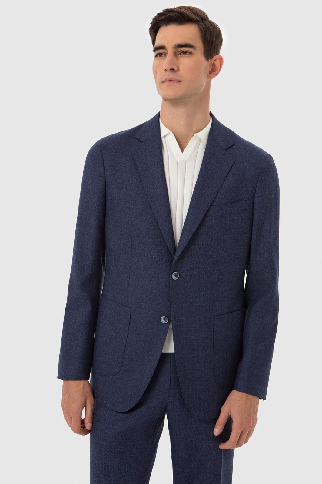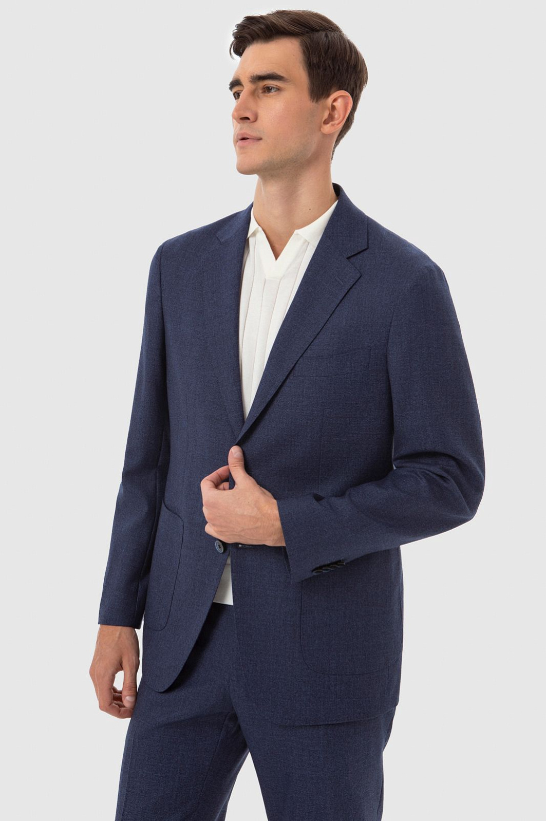 Пиджак KANZLER в красивом оттенке navy c едва заметным меланжевым эффектом одинаково хорошо сочетается с джинсами и с классическими брюками из такого же материала. Дизайнеры сшили модель из мягкой тонкой шерсти Супер 120S, которая приятна в носке и поддерживает оптимальный микроклимат. Легкая конструкция изделия делает ее образцом итальянской портновской школы. Расслабленный стиль обеспечивает свободная посадка и крупные накладные карманы. Дополнить образ можно поло в молочном оттенке и классическими лоферами.
