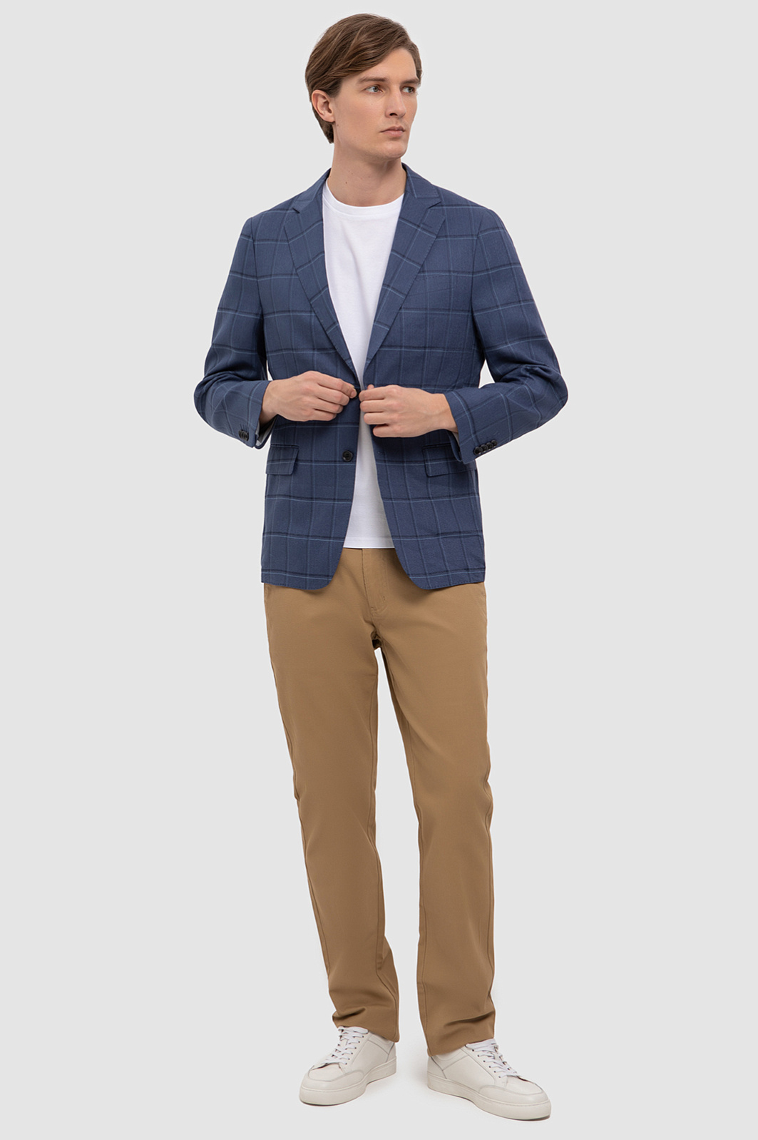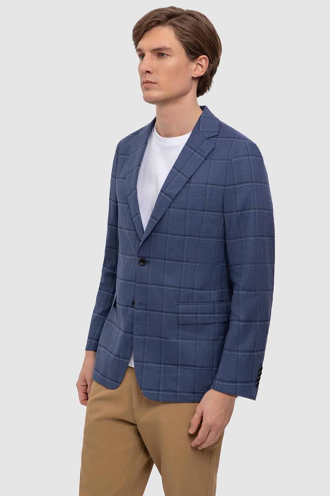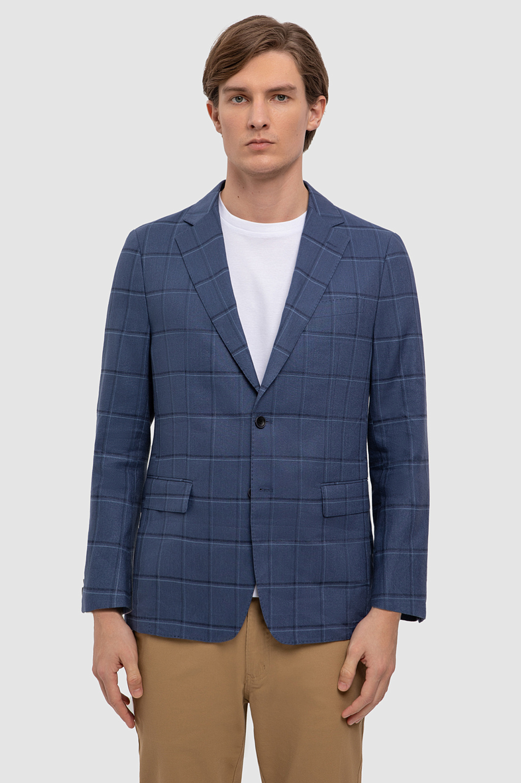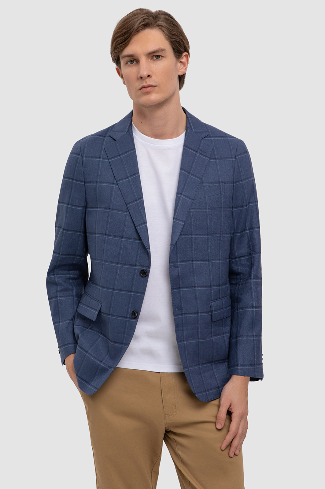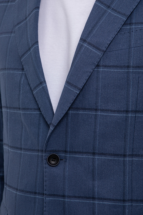 К созданию однобортного пиджака в благородном синем оттенке дизайнеры KANZLER подошли с особым вниманием и учли современные тенденции к комфорту, натуральным материалам и актуальным узорам. Пиджак получился особенно комфортным благодаря натуральному смесовому материалу: для изготовления модели с узкими лацканами и карманами с клапанами выбрали мягкий фактурный трикотаж из дышащего хлопка, усиленного волокнами прочного полиэстера и эластичного спандекса. Модель идеально садится по фигуре и не сковывает движения. Пиджак в стиле кежуал с облегченной подкладкой и мягкой линией плеч привлекает внимание благодаря крупному узору в клетку и гармонично сочетается c белой футболкой и однотонными брюками или шортами. Параметры модели: рост 191, 97-77-99 Размер на модели: 50