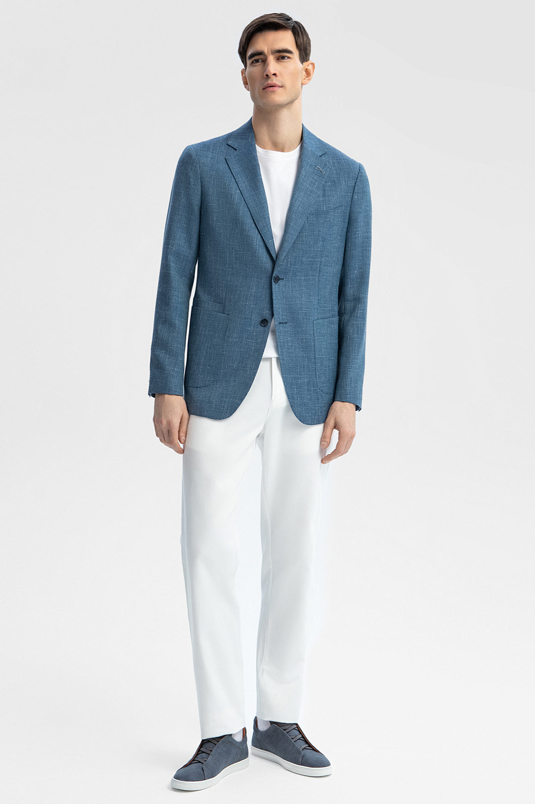 Элегантный серо-голубой однобортный пиджак KANZLER из дорогой ткани (тонкая шерсть со льном и добавлением шелка) адресован мужчинам, которыми движет энергия молодости и любви к жизни. Модель классического кроя, зауженного силуэта с накладными карманами и небольшой фирменной вышивкой на лацкане идеально подходит для того, чтобы совмещать деловую активность и отдых, перемещаясь с важных встреч на светские мероприятия и дружеские встречи. Выбрав для пошива ткань с полотняным переплетением из костюмной шерсти Супер 120S (82%), льна (15%) и шелка (3%), дизайнеры KANZLER доказали, что роскошь может быть практичной. Благодаря преобладанию упругих тонких шерстяных волокон материал не мнется и хорошо сохраняет естественное тепло. Лен усиливает воздухопроницаемость и укрепляет полотно. Гладкие шелковые нити придают материалу благородный лоск. Параметры модели: рост 192, 101-76-97 Размер на модели: 50