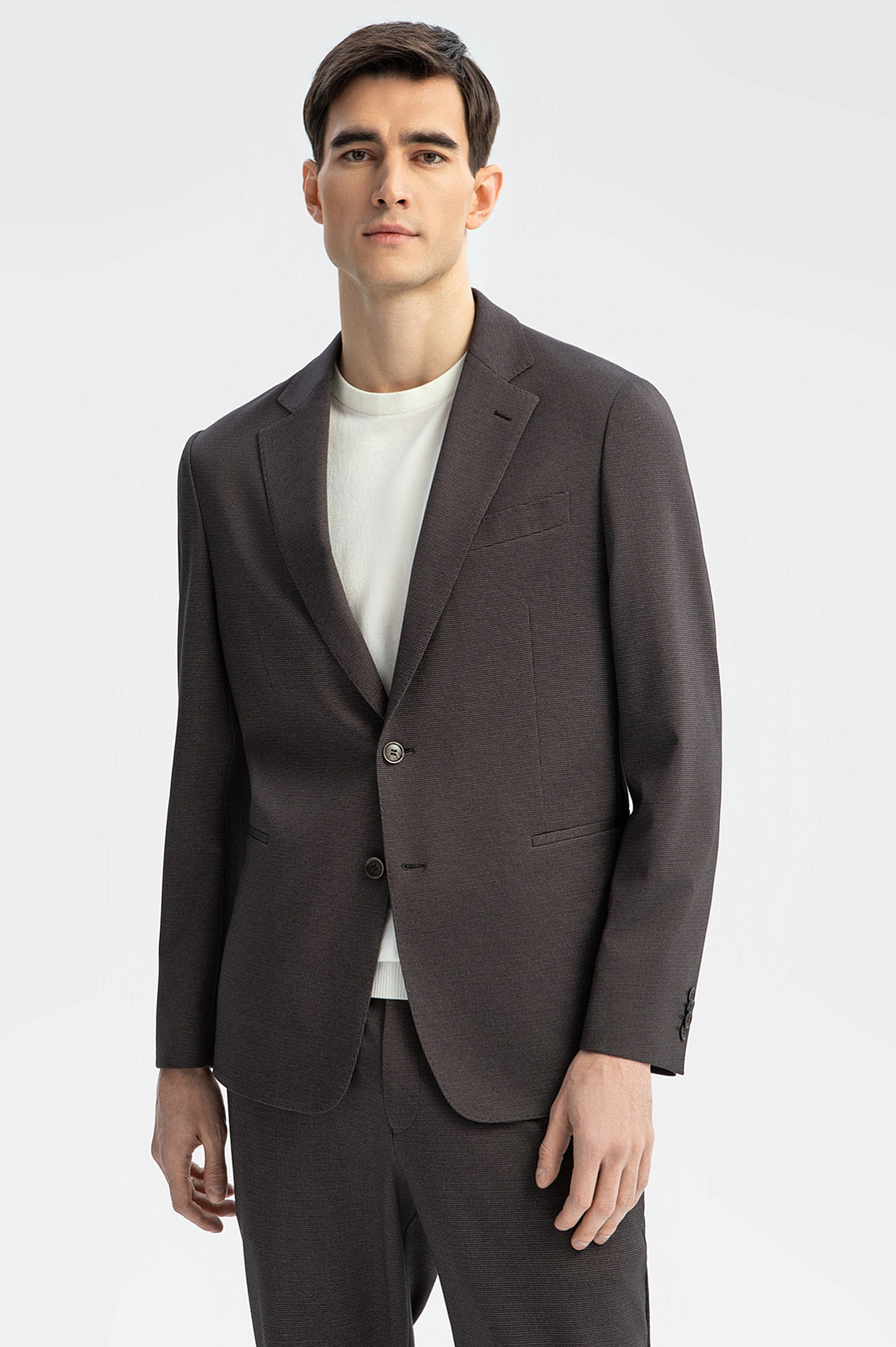 Практичный всесезонный офисный пиджак KANZLER спокойного коричневого оттенка с пуговицами в тон придает деловому образу собранность и основательность. Модель обращает на себя внимание современным лаконичным кроем и деталями — портновской строчкой по краю воротника, лацканов и бортов, нагрудным карманом с листочкой и деликатным рисунком в мелкую клетку. Легкая конструкция без подкладки и универсальный свободный силуэт обеспечивают свободу движений. Технологичная прочная смесовая ткань хорошо держит форму и умеет самовосстанавливаться после дня в офисе. Параметры модели: рост 192, 101-76-97 Размер на модели: 50