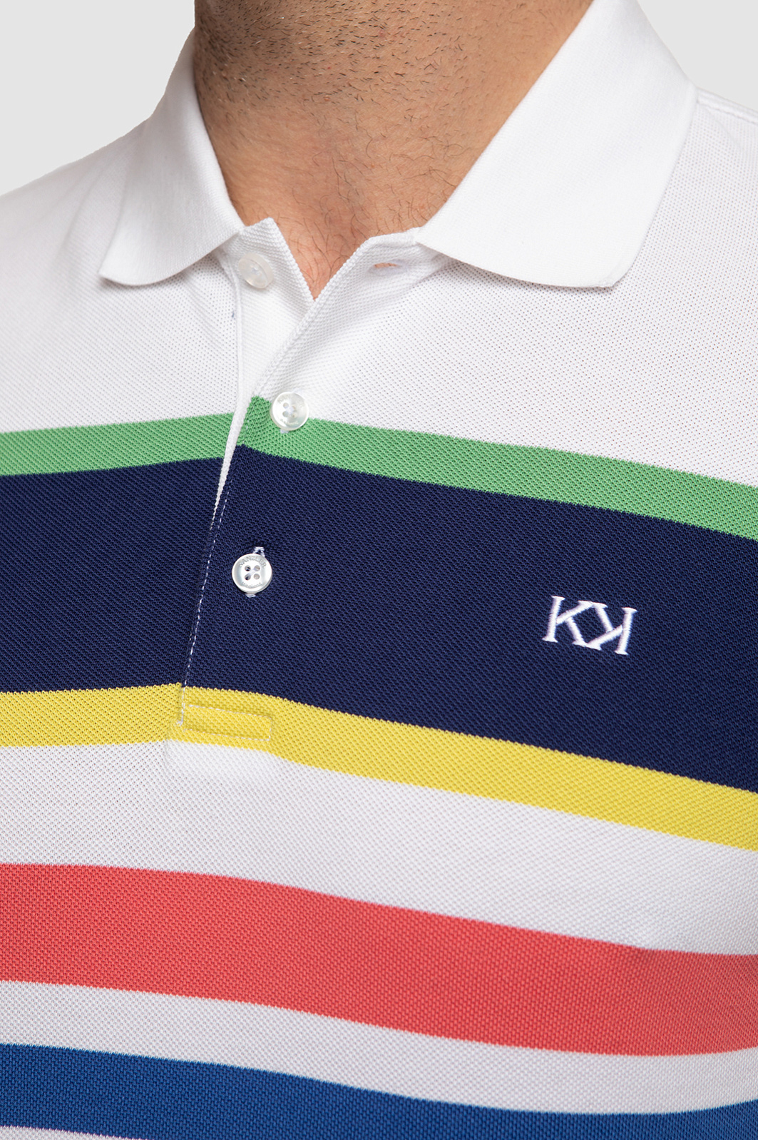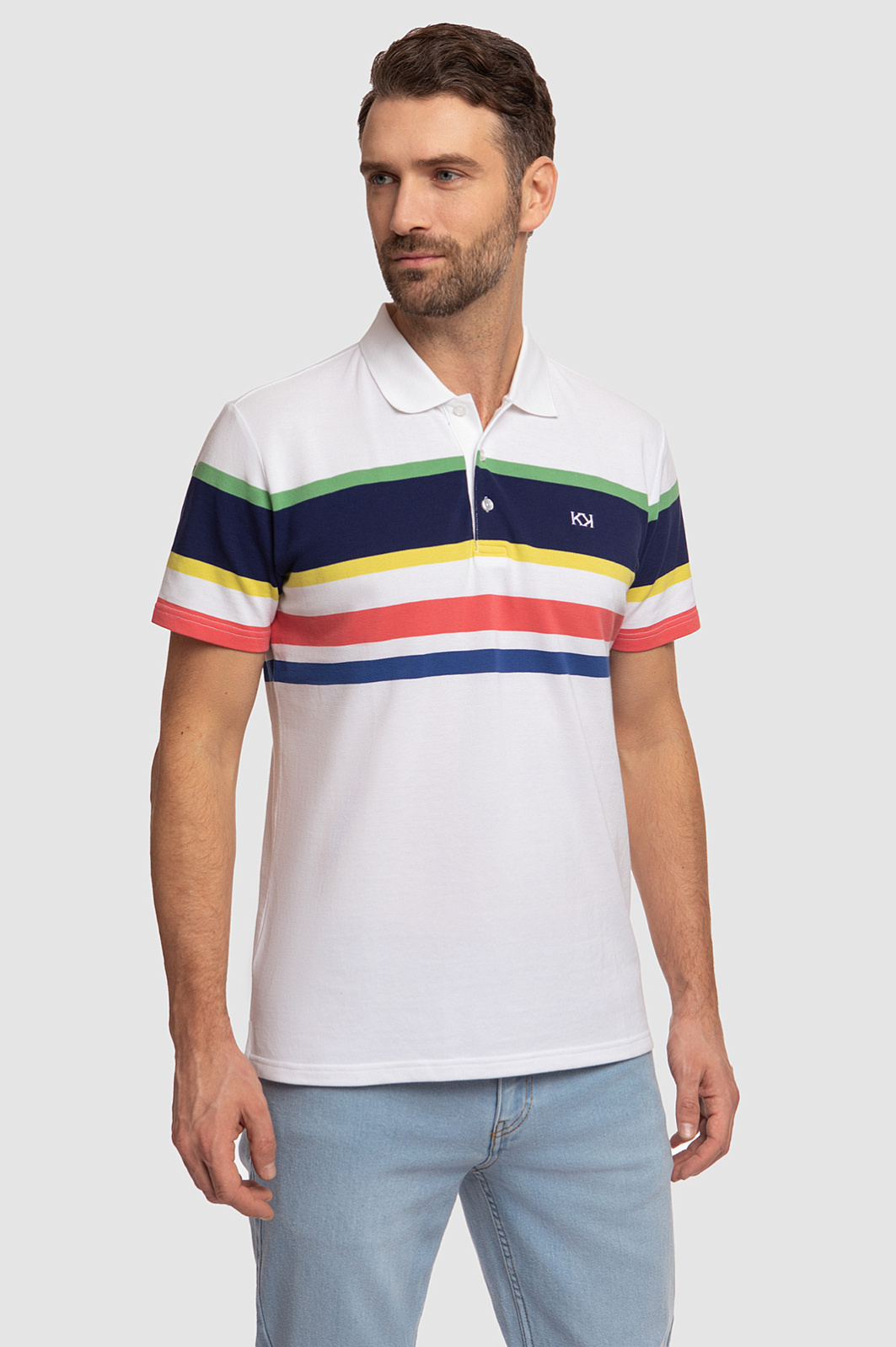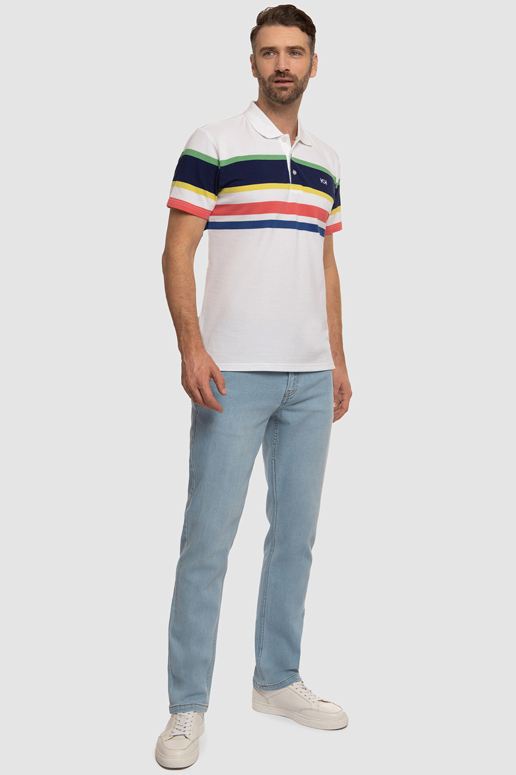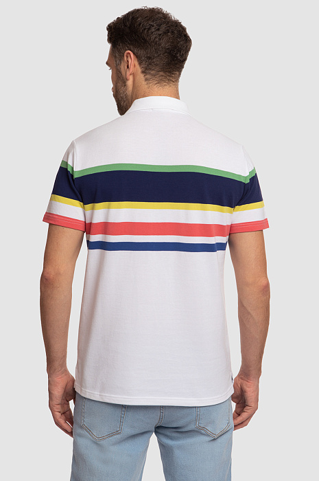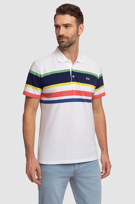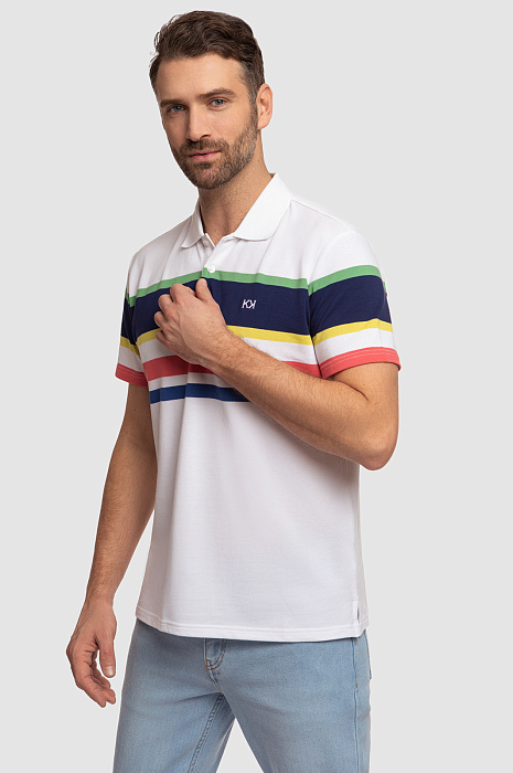 Поло KANZLER прямого кроя с отложным воротником станет ярким акцентом мужского образа. Модель получилась одновременно комфортной, практичной и современной. Благодаря цветным геометричным полоскам поло выглядит ярко и свежо, а основное белое полотно позволяет изделию легко сочетаться с другими элементами гардероба. С полосками спереди отлично рифмуется вышитый логотип бренда в виде двойной заглавной буквы K. Дизайнеры сшили его из мягкого хлопкового трикотажа. Шелковистый на ощупь натуральный хлопок хорошо тянется, поэтому изделие комфортно садится по фигуре и не сковывает движения. Советуем дополнить образ прямыми джинсами в оттеке navy.