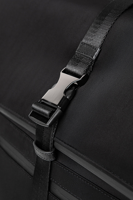 Легкий черный рюкзак KANZLER из нейлона с кожаной отделкой в духе эстетики минимализма и хайтек, навеянной эстетикой Сеула — города передовых технологий и культурного разнообразия. Застежка-молния и дополнительный ремень с пряжкой усиливают защиту содержимого и придают рюкзаку урбанистический вид. Внутри — скрытые отделения для гаджетов, кабелей, документов, снаружи — плоские аккуратные карманы. С помощью ручки и широких регулируемых лямок рюкзак можно носить в руке или на спине.