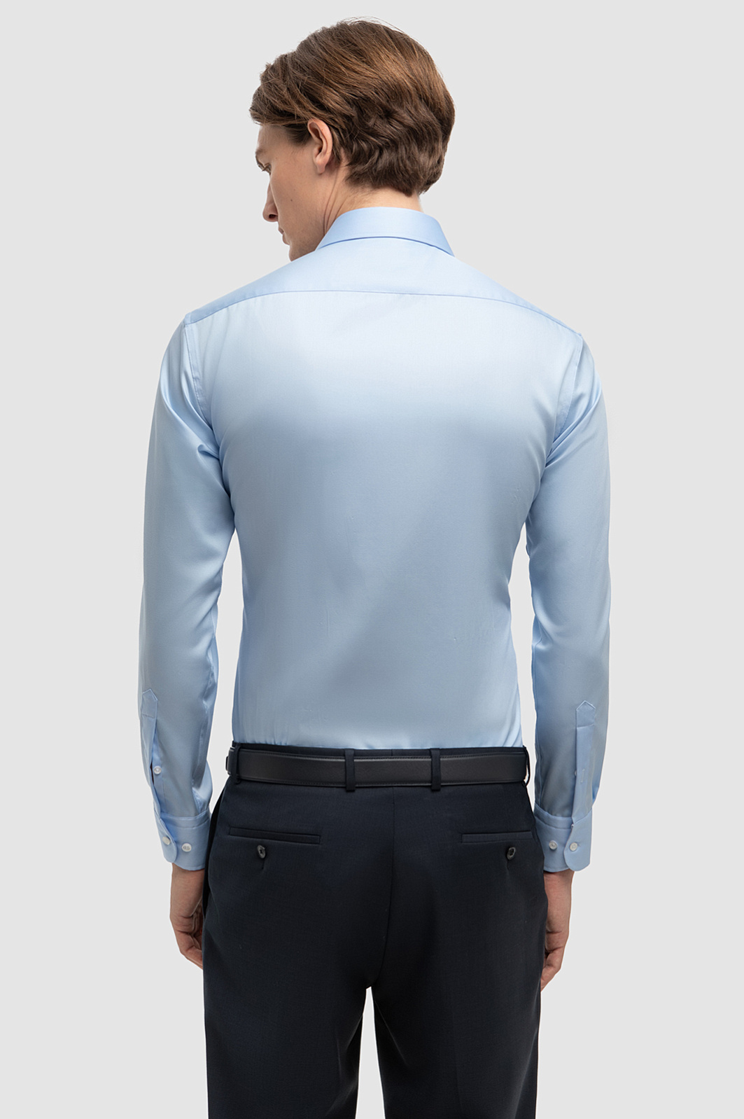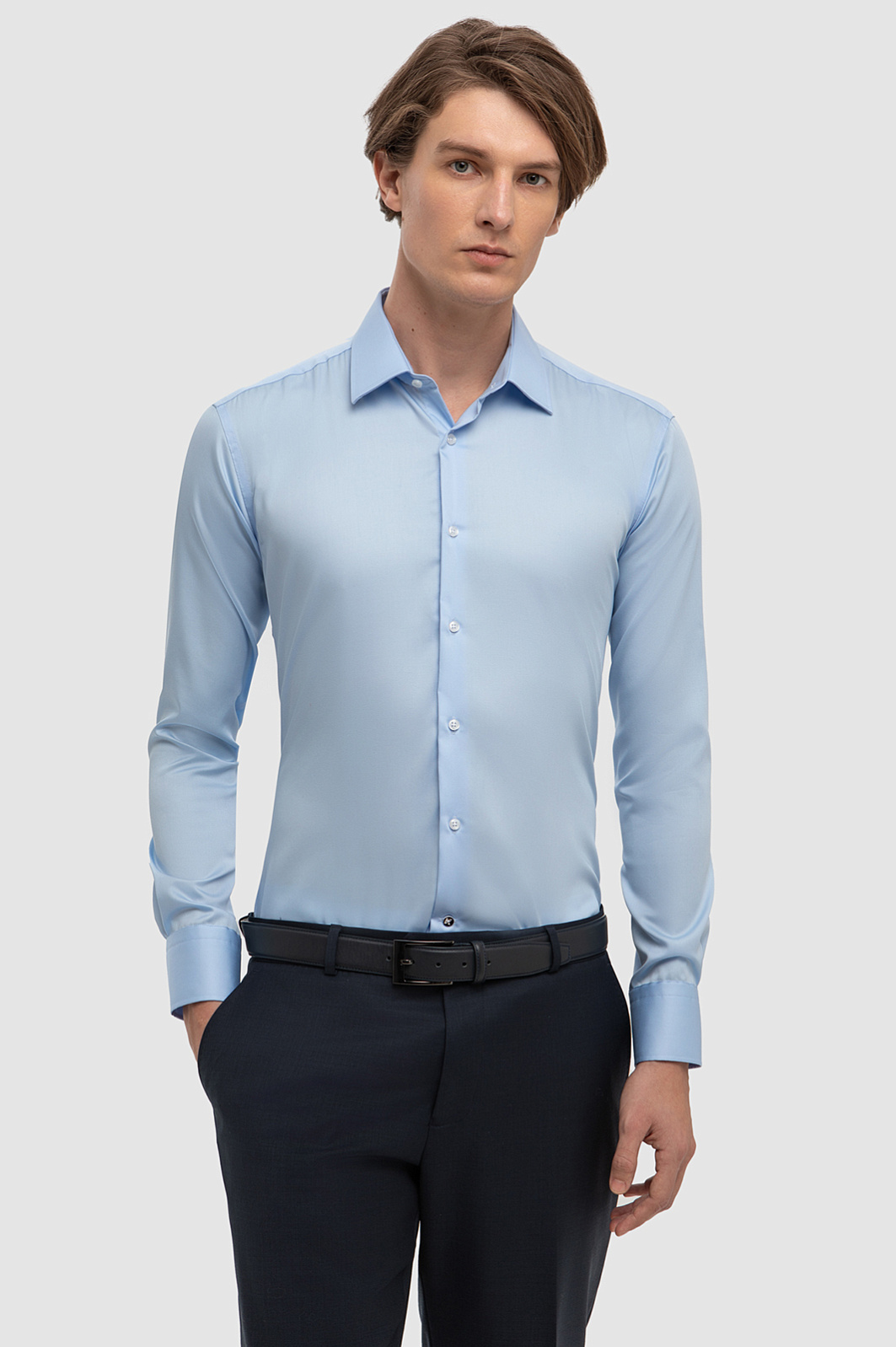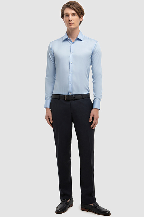 Для пошива приталенной сорочки дизайнеры KANZLER выбрали тонкую хлопковую ткань, которая обеспечивает отличную воздухопроницаемость, мягкость и комфорт в течение всего дня. Нейтральный голубой цвет гладкого текстиля стал идеальной основой для повседневных деловых образов, прекрасно заменяя классическую белую рубашку в деловых ансамблях. Специальная технология легкой утюжки приятно удивит и обеспечит простоту в уходе, сохраняя безупречный вид изделия с минимальными усилиями. Пастельный голубой цвет становится более выразительным в сочетании с синим или белым цветом и позволяет создавать разнообразные стильные комбинации. Наши стилисты советуют комбинировать сорочку с темно-синими пиджаком, брюками и аксессуарами в тон, чтобы создать завершенный деловой образ. Параметры модели: рост 191, 97-77-99 Размер на модели: 40