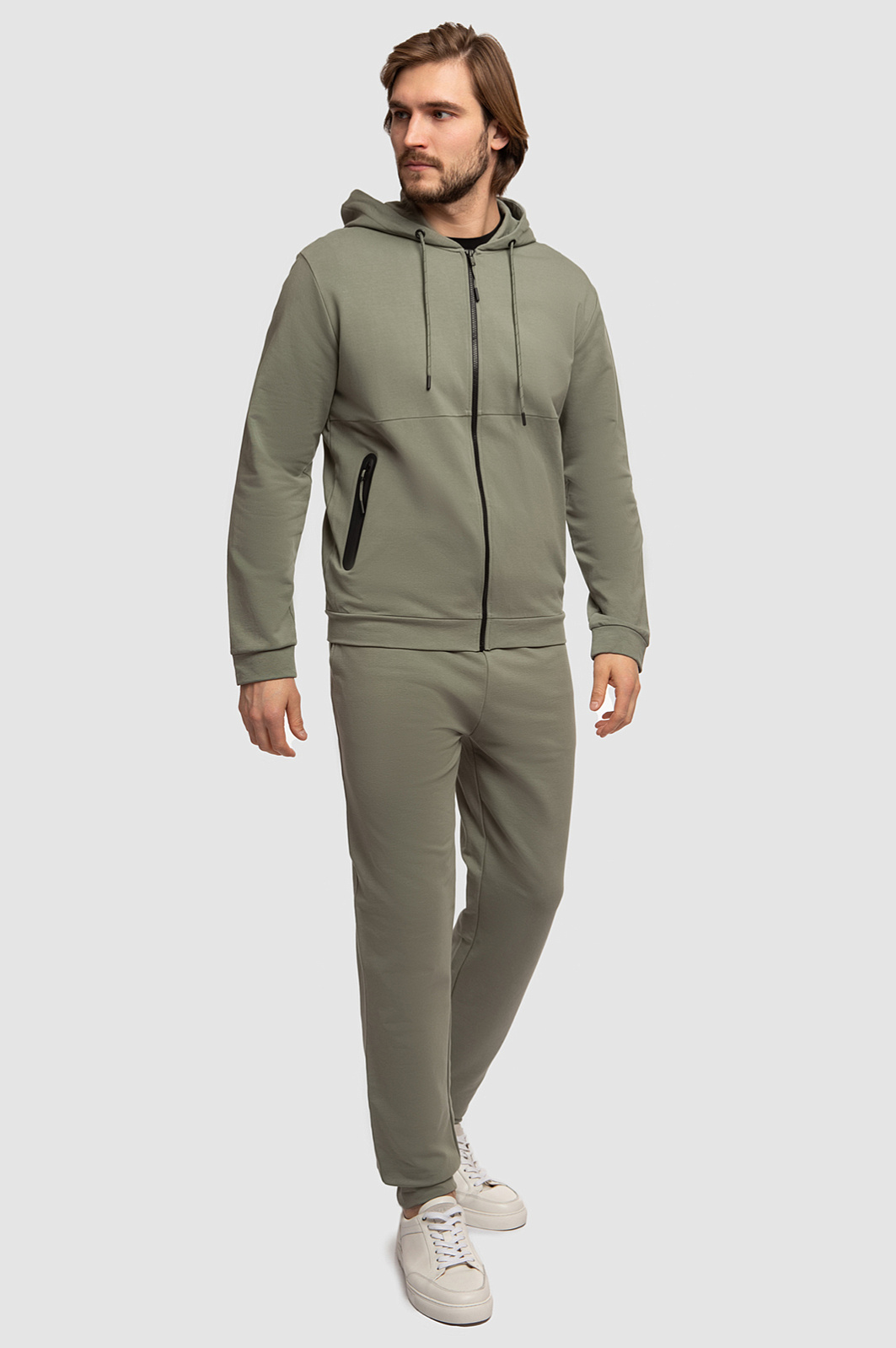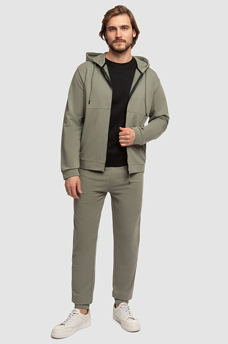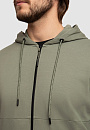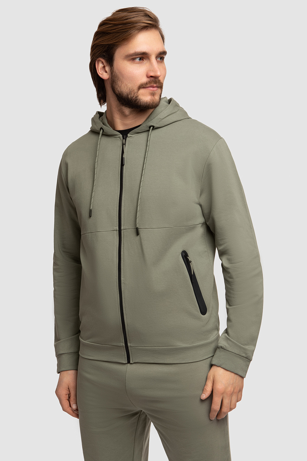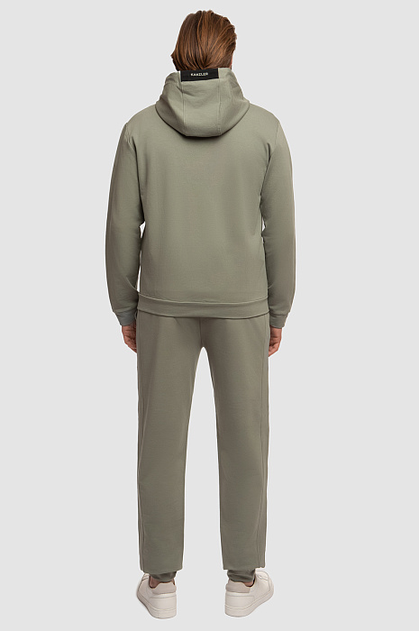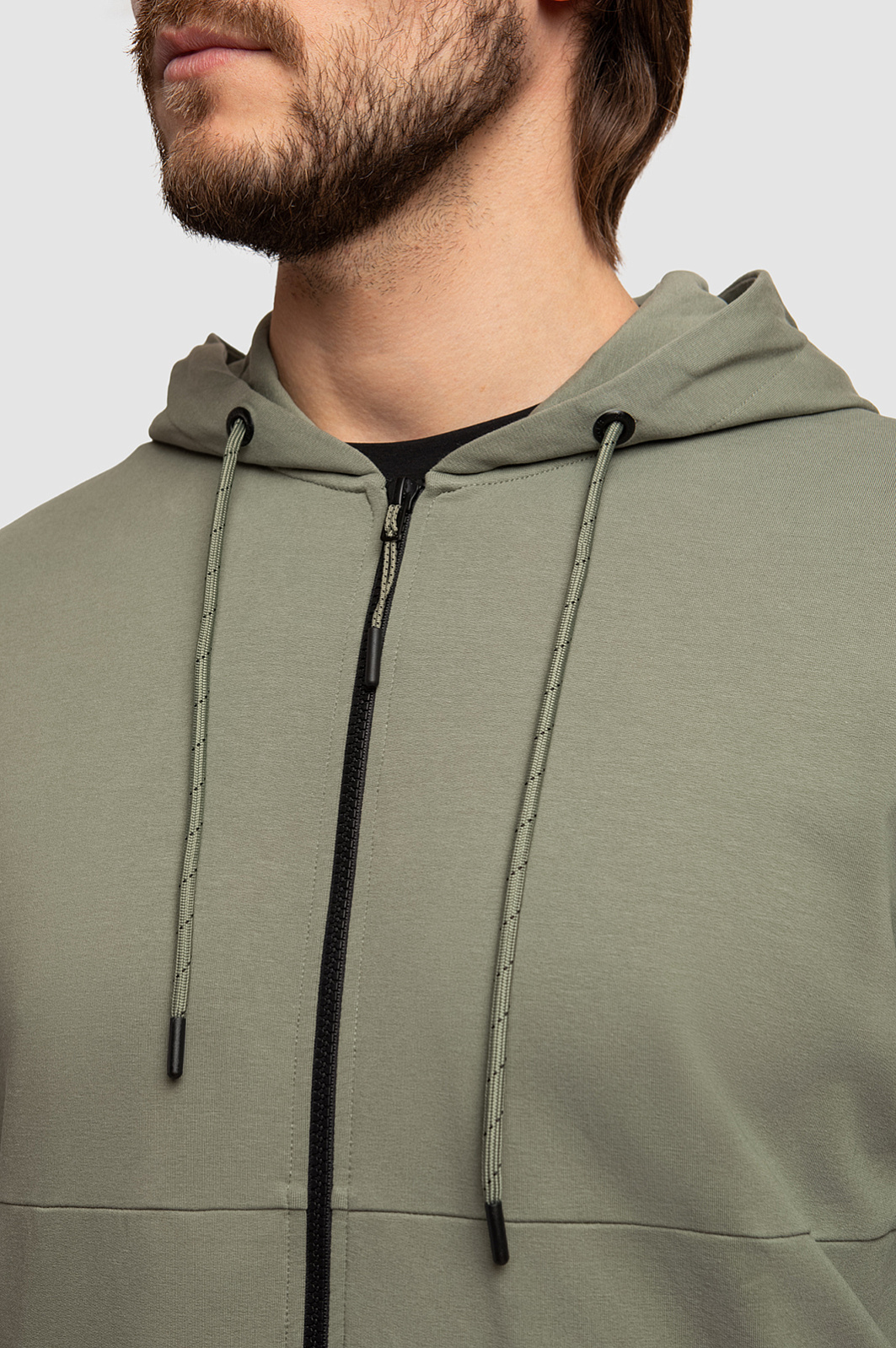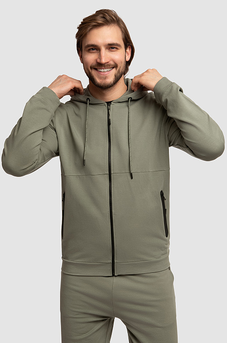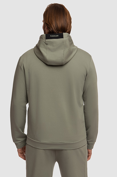 Cпортивная толстовка KANZLER в трендовом оливковом цвете получилась максимально комфортной. Дизайнеры выполнили толстовку на молнии из мягкого смесового материала на основе натурального хлопка. Чтобы сделать ткань прочнее и эластичнее, придать ей деликатный блеск, в состав добавили волокна спандекса. Хлопковые волокна обеспечивают комфорт и хороший воздухообмен, что важно во время активных тренировок, а волокна спандекса обеспечивают способность возвращаться к первоначальной форме после стирки и растяжения. Благородный оттенок из палитры зеленого особенно актуален в текущем сезоне. Обратите внимание на детали: молния waterproof, карманы, в которые можно убрать все важные мелочи и глубокий капюшон, защищающий от ветра. Интересная особенность модели - контрастный брендированный патч на капюшоне. Добавьте к образу трикотажные брюки в таком же оттенке. Комплект обеспечит комфорт и удовольствие от занятий спортом или длительных прогулок.