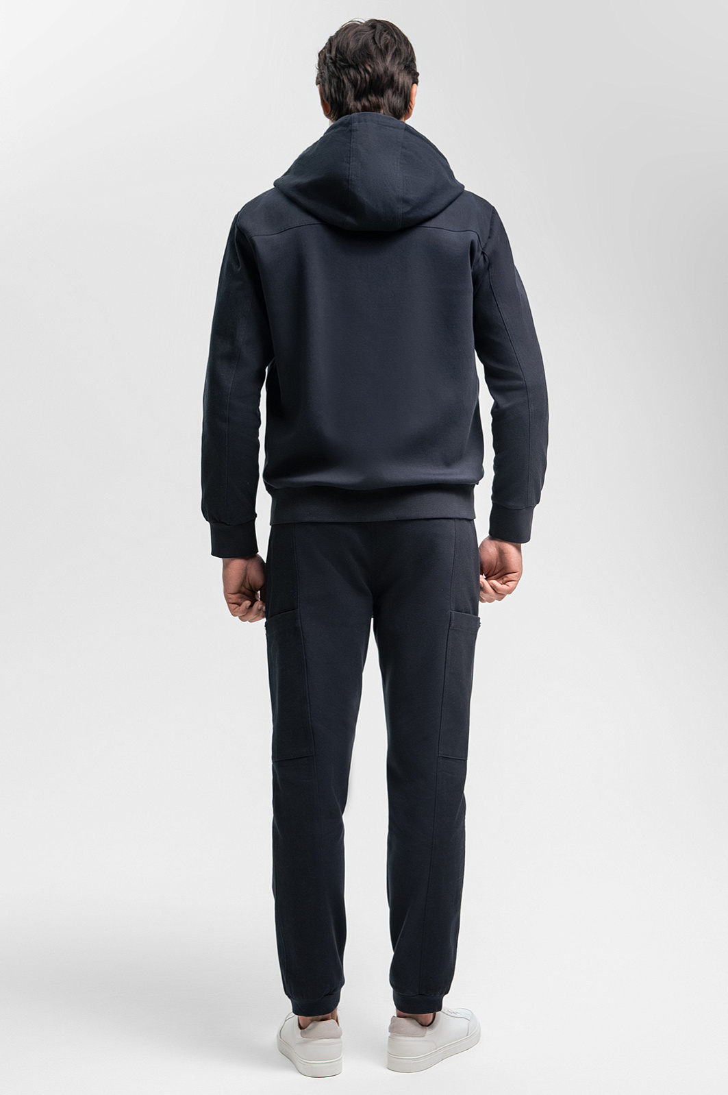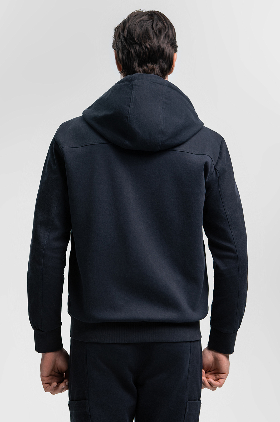 Толстовка на молнии с капюшоном KANZLER – комфортная модель для спорта, активного отдыха и повседневных образов в стиле спорт кежуал. Выполненная из двух инновационных материалов, она сочетает мягкость и прочность. Основная часть из 100% хлопка обеспечивает комфорт и воздухопроницаемость. Вставки с добавлением синтетических волокон (80% хлопок, 16% полиэстер, 4% спандекс) отвечают за устойчивость формы и эластичность. Практичный капюшон защищает от ветра. Темно-синий оттенок гармонирует с большинством базовых вещей, делая эту модель универсальным решением для повседневных образов. Параметры модели: рост 190, 103-83-99 Размер на модели: 50