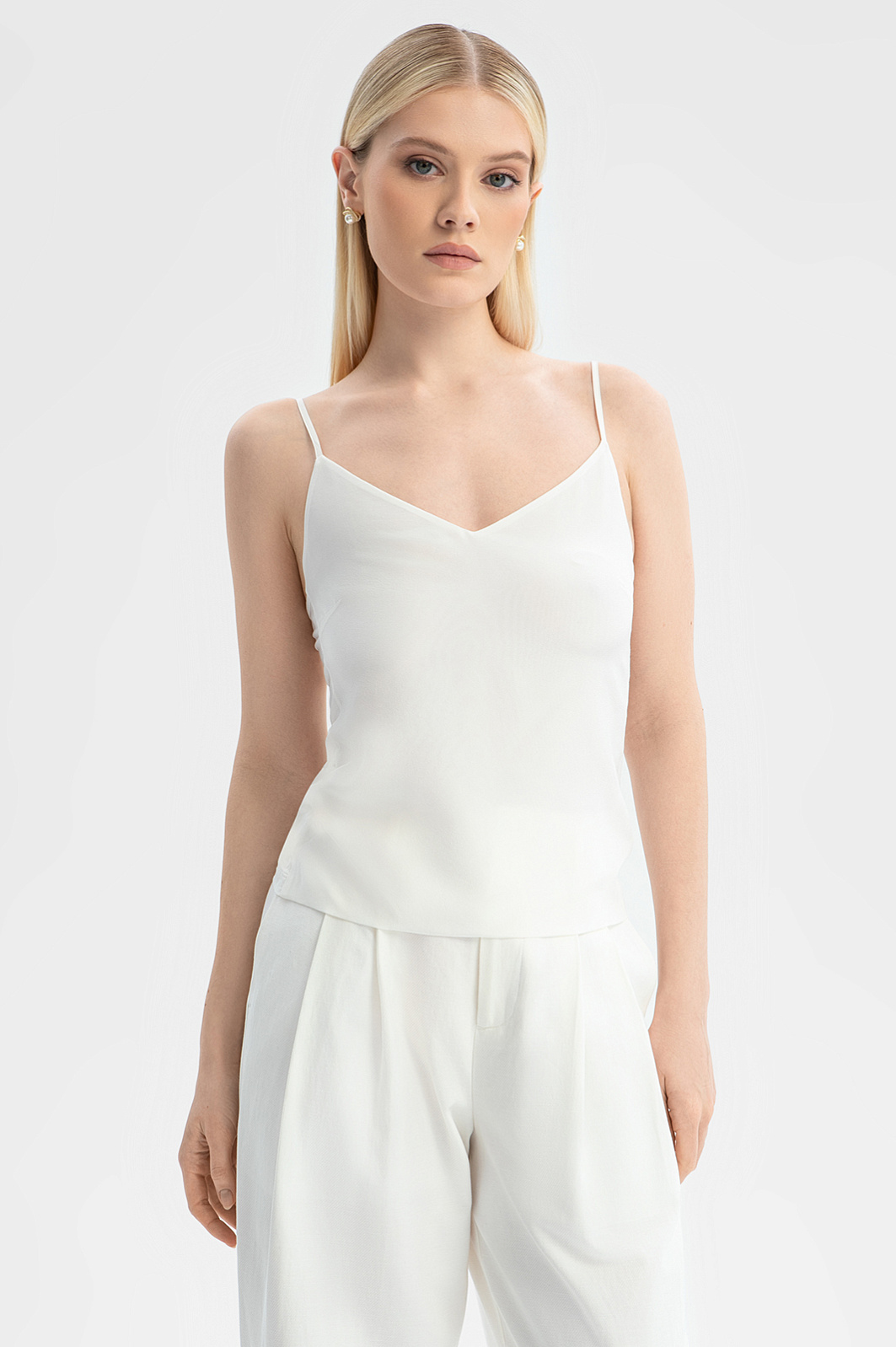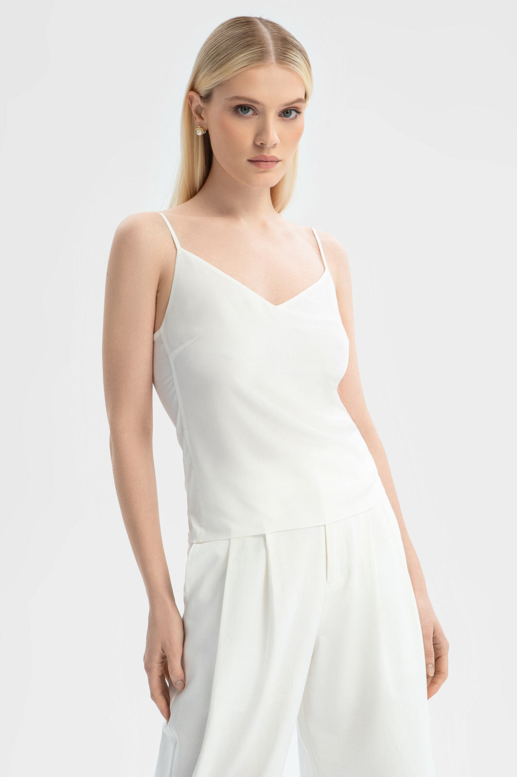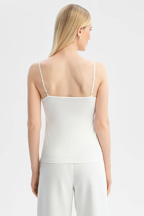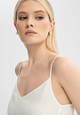 Белый шелковый топ KANZLER придаст повседневному образу хрупкость и женственность. Изящная соблазнительная модель на тонких бретелях с приталенным кроем и широким треугольным вырезом привлекает внимание к плечам и ключицам. Топ можно надеть в качестве самостоятельного предмета гардероба или дополнить легким жакетом. Передняя часть выполнена из невесомого натурального шелка, который красиво облегает изгибы женской фигуры, спинка — из мягкого модала. Это легкие гипоаллергенные дышащие материалы, которые особенно приятно носить в теплые дни. Параметры модели: рост 175, 88-65-92 Размер на модели: S