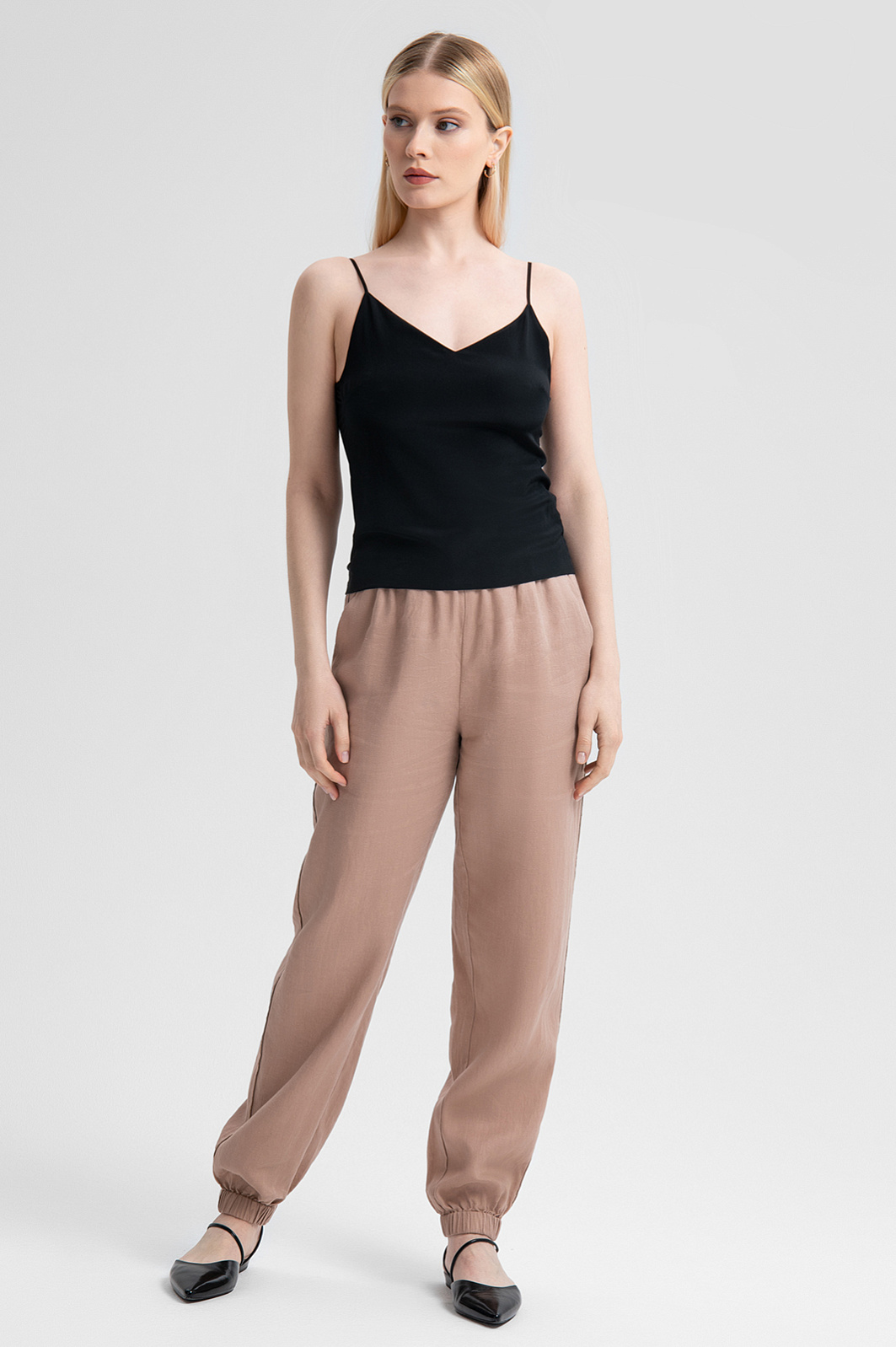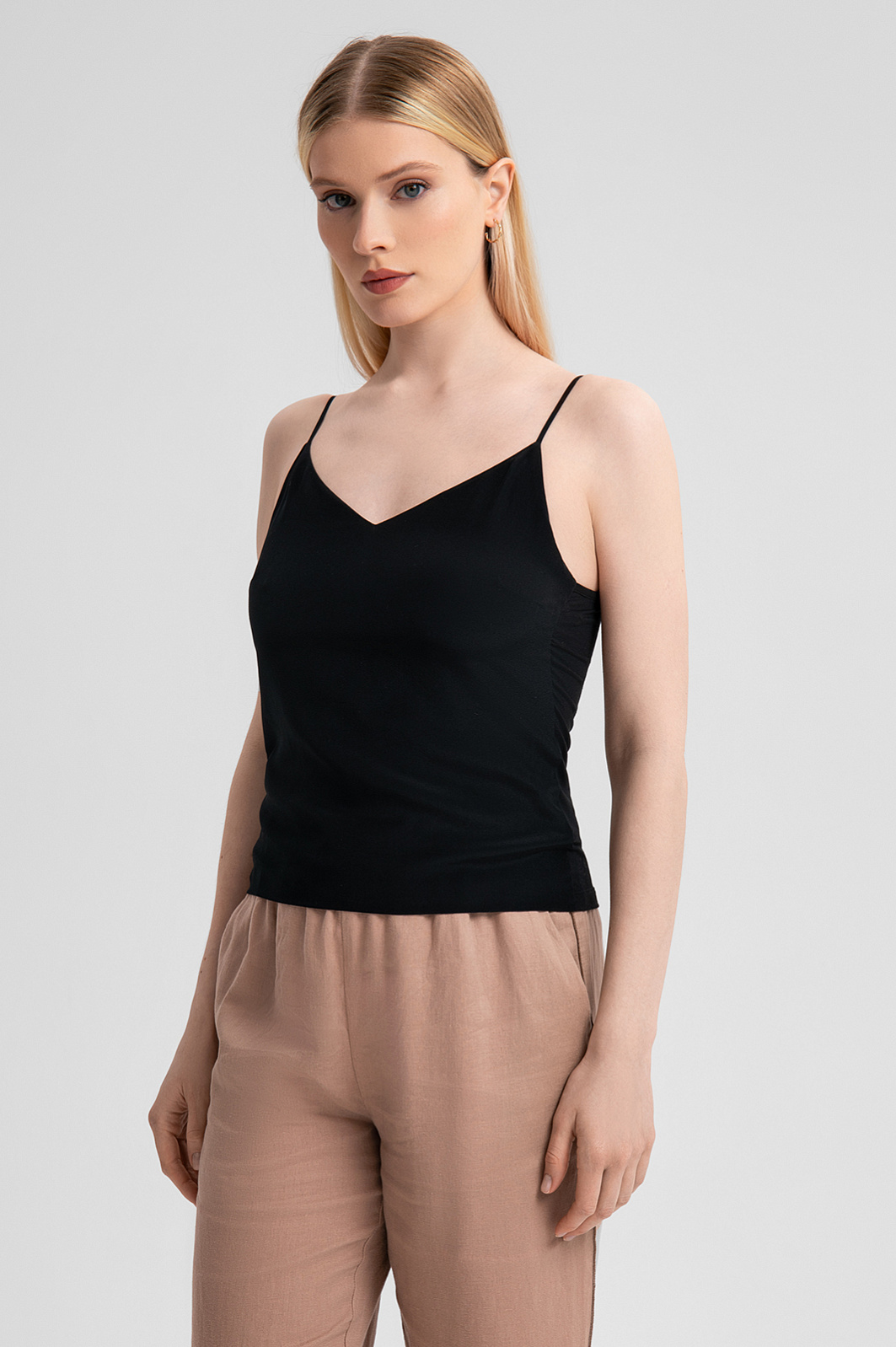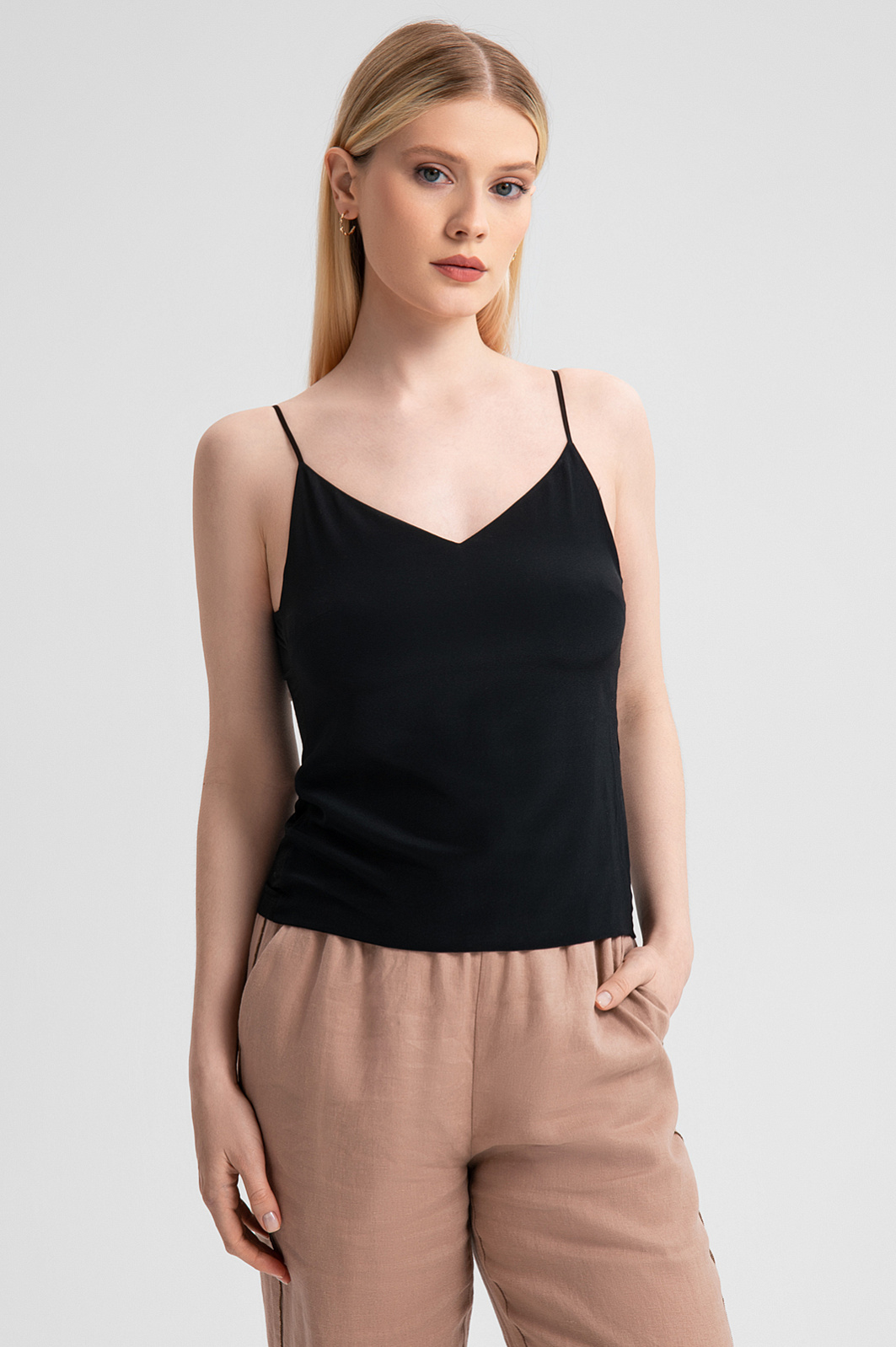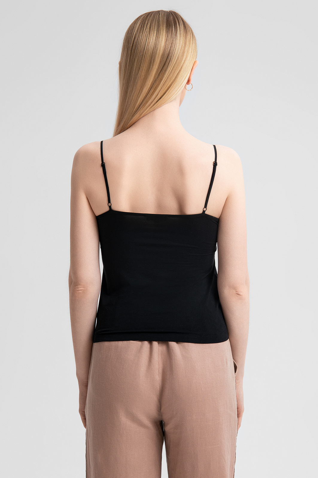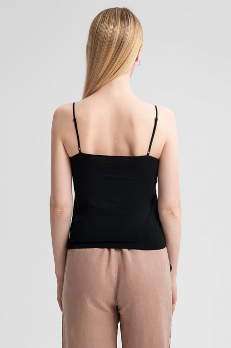 Черный топ KANZLER – роскошная базовая модель, которая станет акцентом как повседневного, так и вечернего образа. Основная часть выполнена из 100% шелка. Натуральный материал с гладкой фактурой обладает невероятной легкостью и дарит коже ощущение нежности. Спинка из модала и спандекса обеспечивает идеальную посадку по фигуре, свободу движения и максимальный комфорт. Минималистичный дизайн с тонкими регулируемыми бретельками и треугольным вырезом подчеркивает изящество и женственность силуэта. Черный цвет универсален и позволяет легко комбинировать топ с одеждой разных стилей, будь то офисный образ с классическим пиджаком или непринужденный летний комплект с легкими брюками. Параметры модели: рост 175, 88-65-92 Размер на модели: S