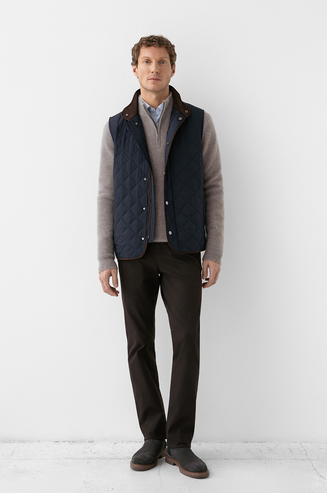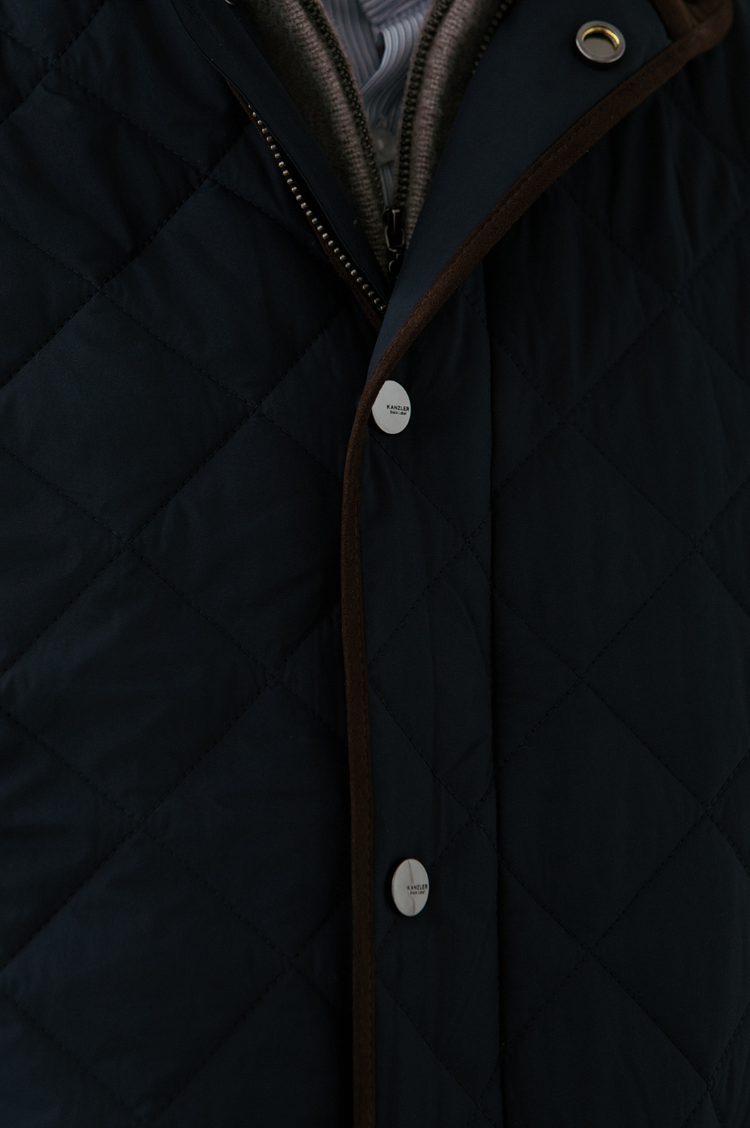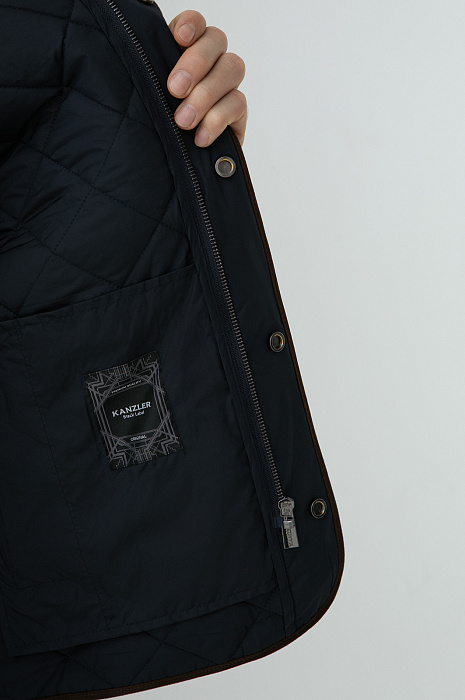 Стёганый жилет KANZLER в глубокого синего оттенке с коричневой отделкой — лёгкий способ утеплиться в прохладные дни и холодное межсезонье. Ромбовидный узор отсылает к классике английского стиля. Коричневый подборт добавляет образу теплоту и благородство. Широкая планка, прикрывающая молнию, и воротник-стойка служат надежным барьером от ветра. Водоотталкивающая обработка делает жилет неуязвимым для дождя. Внешний слой, подкладка и внутренний наполнитель сделаны из полиэстера — надежного и прочного синтетического материала, который прослужит долго, сохраняя свои защитный качества и аккуратный внешний вид.